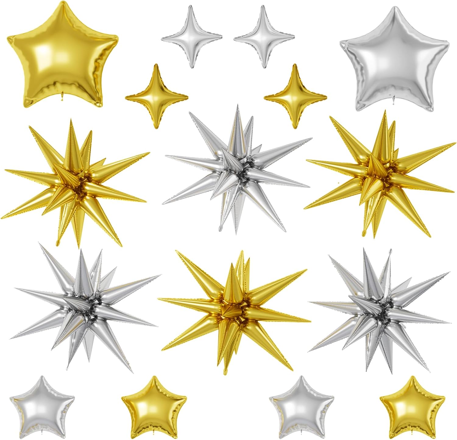 - ăGold Silver Star BalloonsăThe package includes:6pcs 22-inch Star-Shape balloons(Gold*3,Silver*3), 4pcs 10-inch Four-Pointed Star balloons(Gold*2,Silver*2), 2pcs 18-inch Five-Pointed Star balloons(Gold*1,Silver*1), 4pcs 10-inch Five-Pointed Star Shape balloons(Gold*2,Silver*2),1 dispense and 1 straw. These foil star balloons are Great for birthdays, weddings, baby showers, and engagement parties
