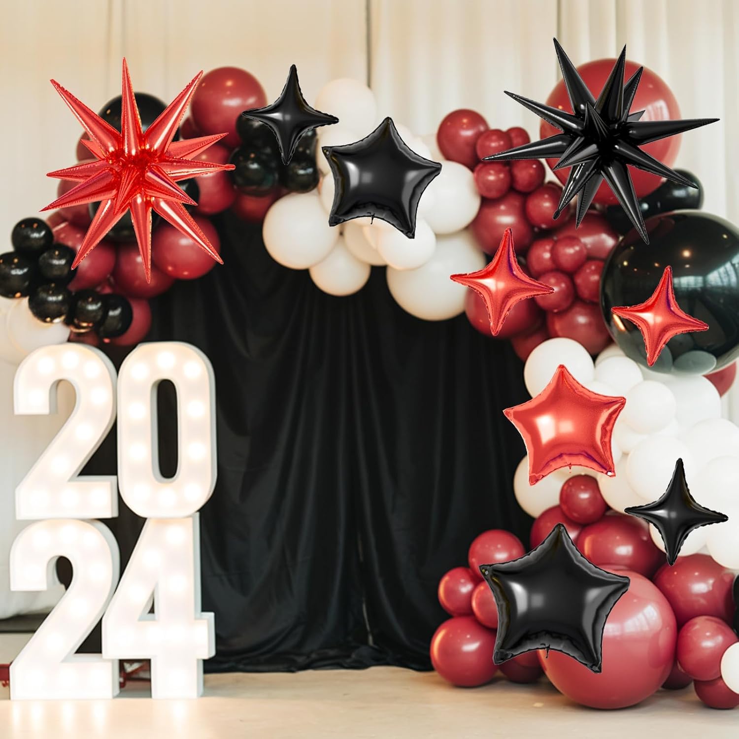 16 Pcs Red Black Star Balloons, 22/18/10 Inch Foil Balloons, Explosion Conee Four-Pointed Balloon for Kids Birthday Graduation Prom Wedding Baby Shower Casino Party Decorations
