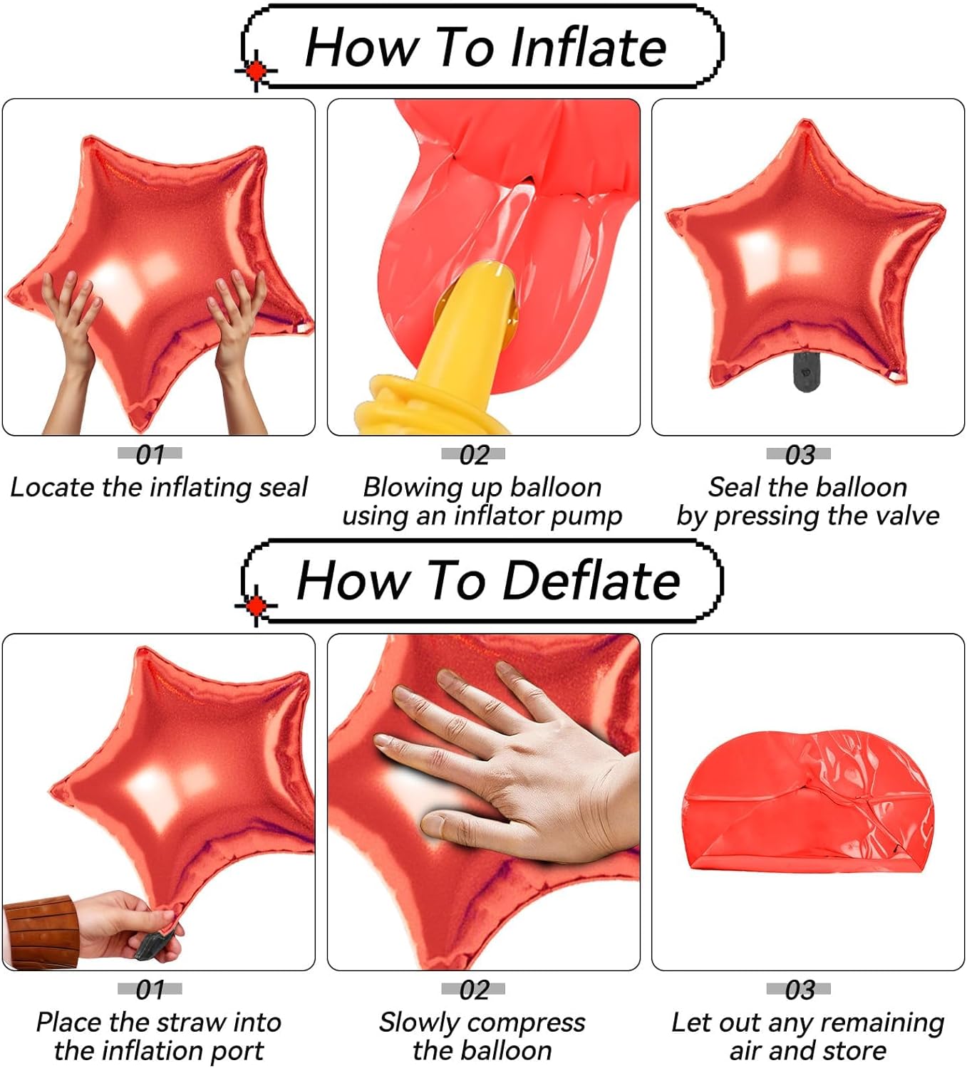 - ăEffortless SetupăInflate with helium or air using a pump and secure easily for polished decor. These red blue silver Star Foil balloons are simple to assemble and reusable for multiple events, making decorating quick and effortless.