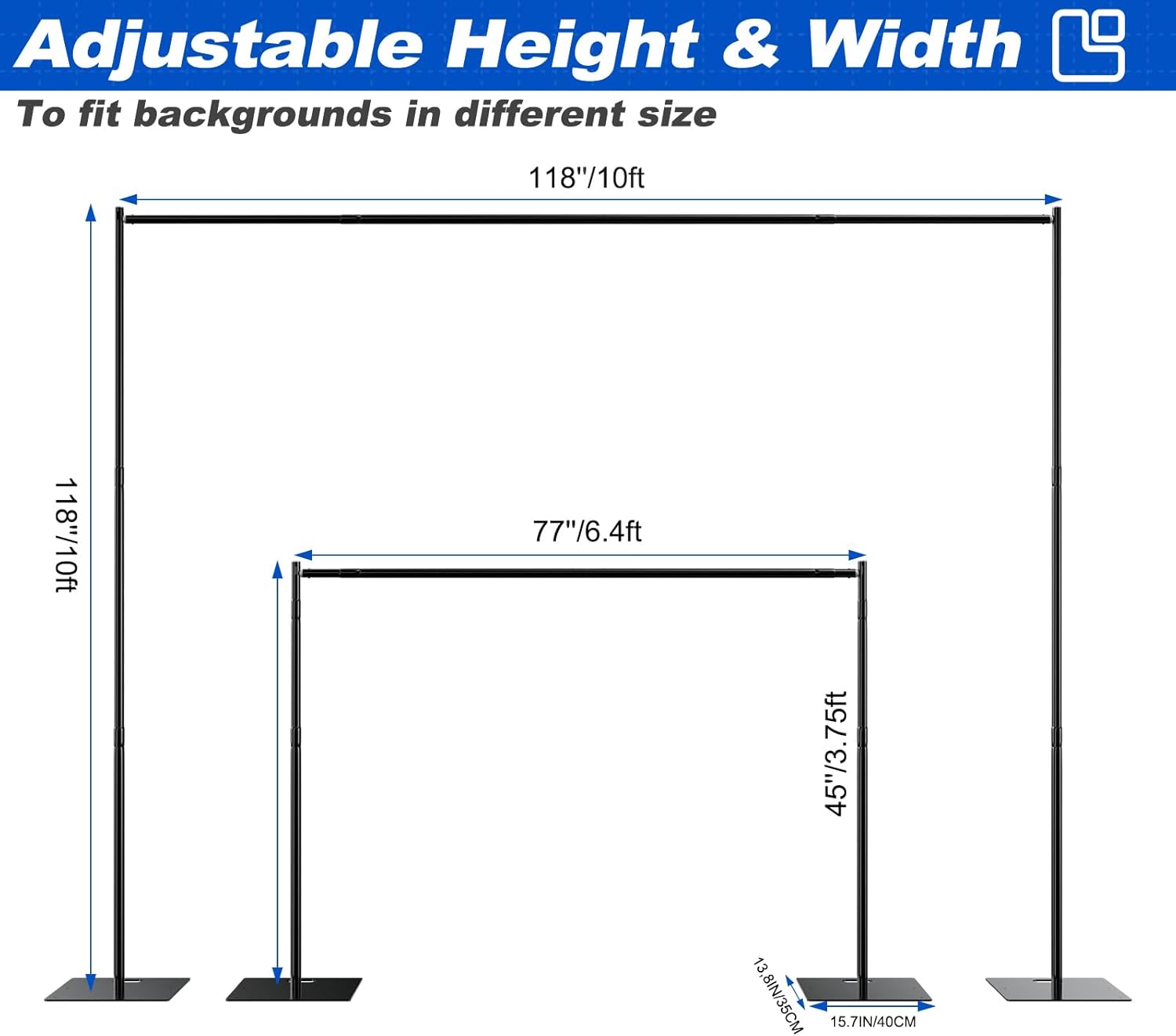 - Adjustable Size: Customizable height (from 5.6 ft to 10 ft) and width (from 5.6 ft to 10 ft) to suit various backdrop sizes and applications.