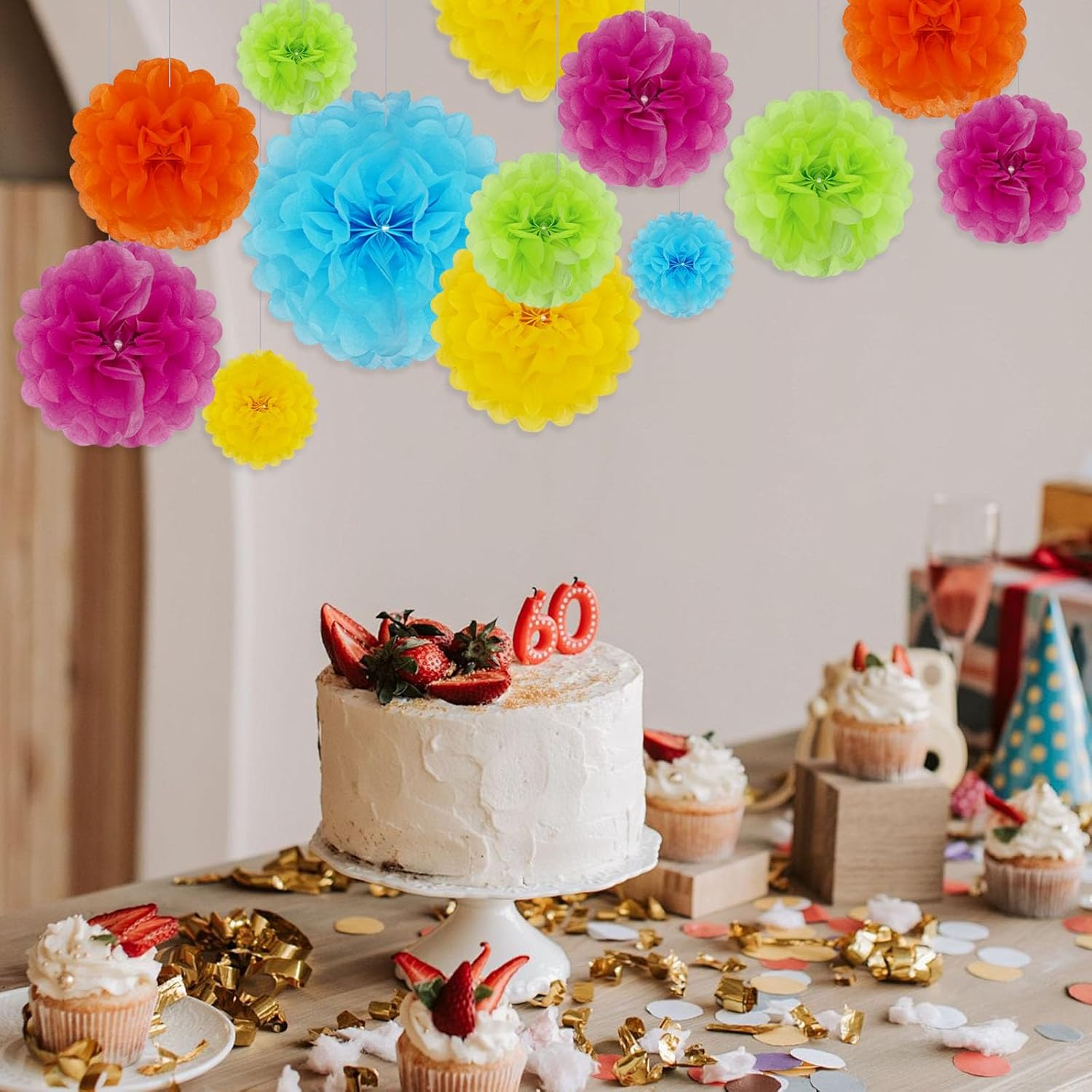 - 【Paper Flowers Party Decorations】Tissue paper pom poms fit with any party style or decor. You can attach paper flower decorations to walls, use them as centerpiece table decorations or as hanging decorations from ceilings or add a unique look to any room or backyard space. Beautiful party decorations for birthdays, baby showers, bridal showers, mexican paper flower decorations, anniversaries, classrooms, festivals Easter, Valentine's Day, Halloween, Christmas, New Year parties, and more.