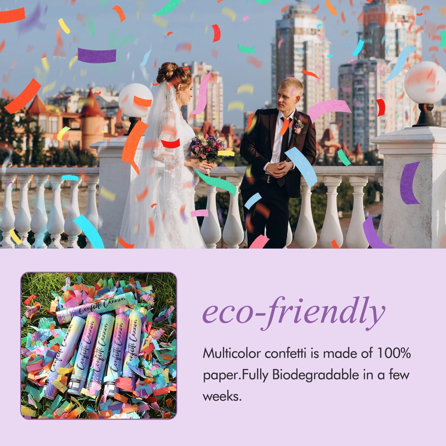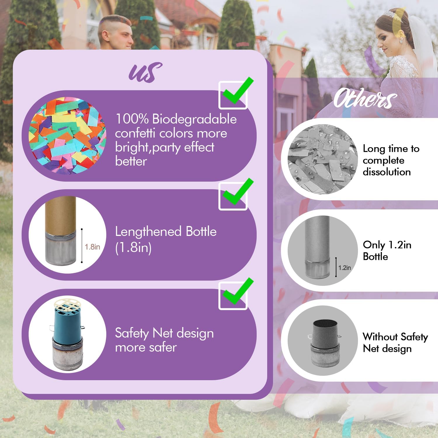 - Security and upgrade materials; Equipped with an internal safety net, these Confetti Cannon prevent any firmware from popping out, ensuring a safe and worry-free experience for both adults and kids. Using craft rice paper, the color is more vivid and bright. Thin and light than other paper shavings in the air floating longer effect more