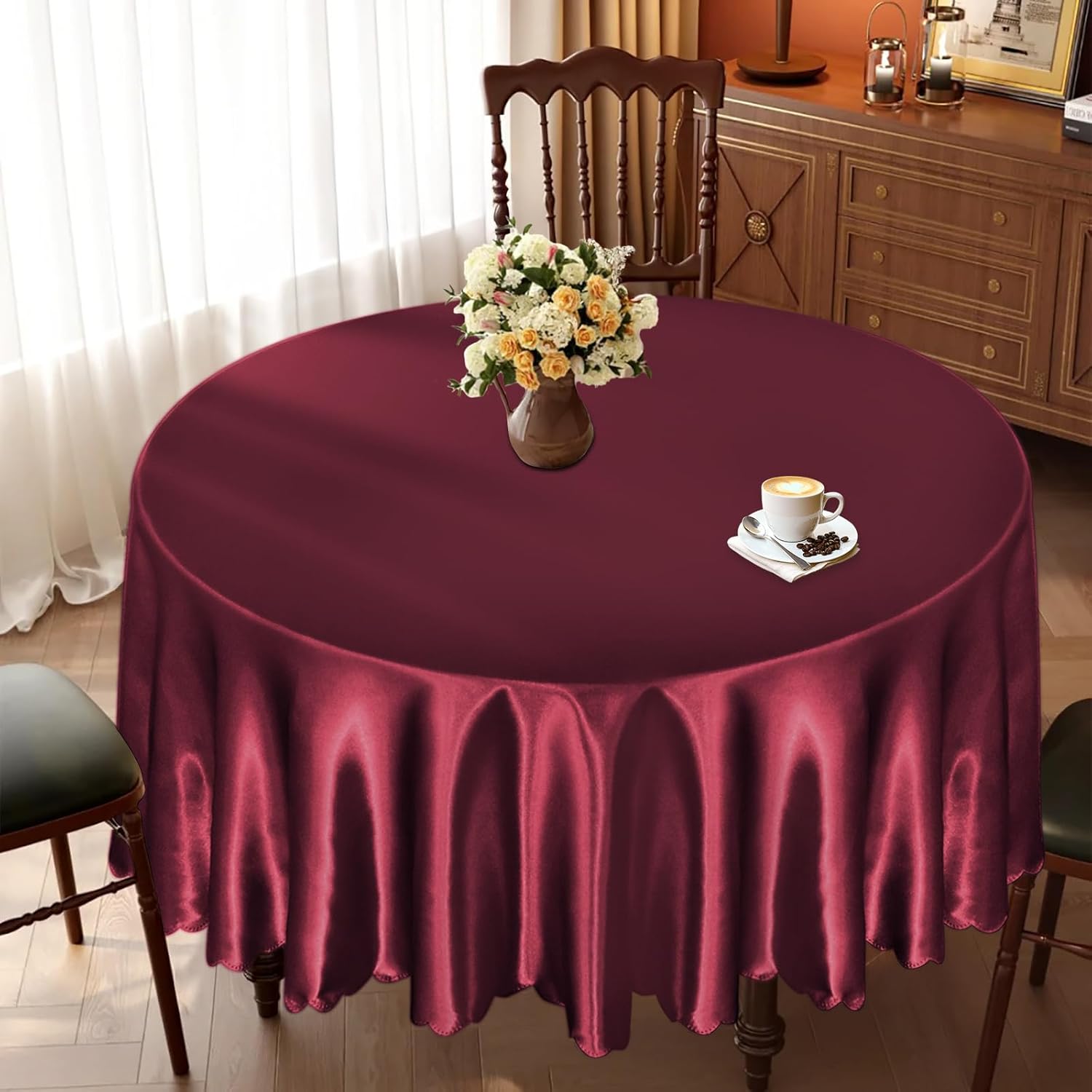 KKJIAF 1 Pack 108 Inch Round Table Cloth, Burgundy Overlay Round Satin Table Cover, Silky Satin Dining Tablecloths for Wedding Buffet Parties Banquet Decoration