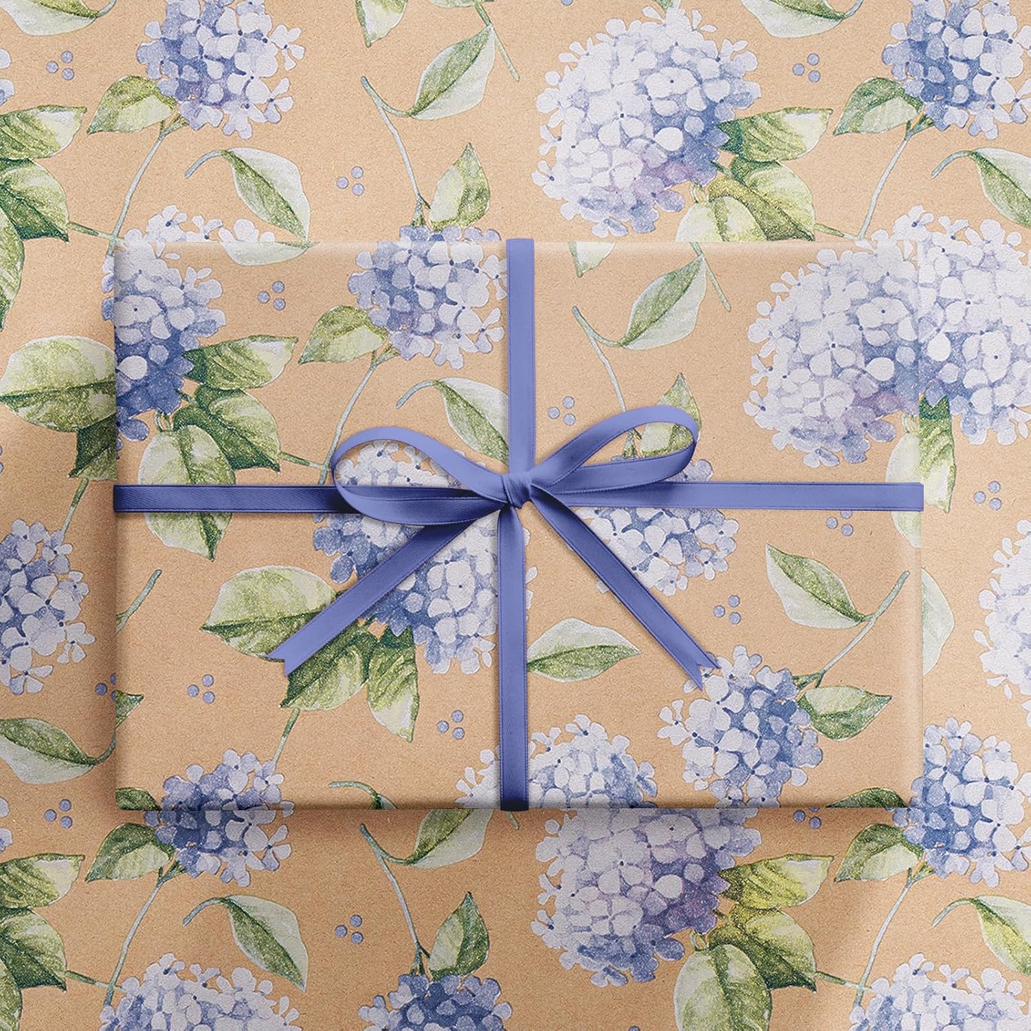 - Elegant Wrapping Paper: Features purple hydrangea flowers with delicate blooms, paired with vibrant green leaves against a warm kraft paper background. Perfect for adding a refined touch to any gift, it brings the beauty of blooming flowers and natural elements into your wrapping