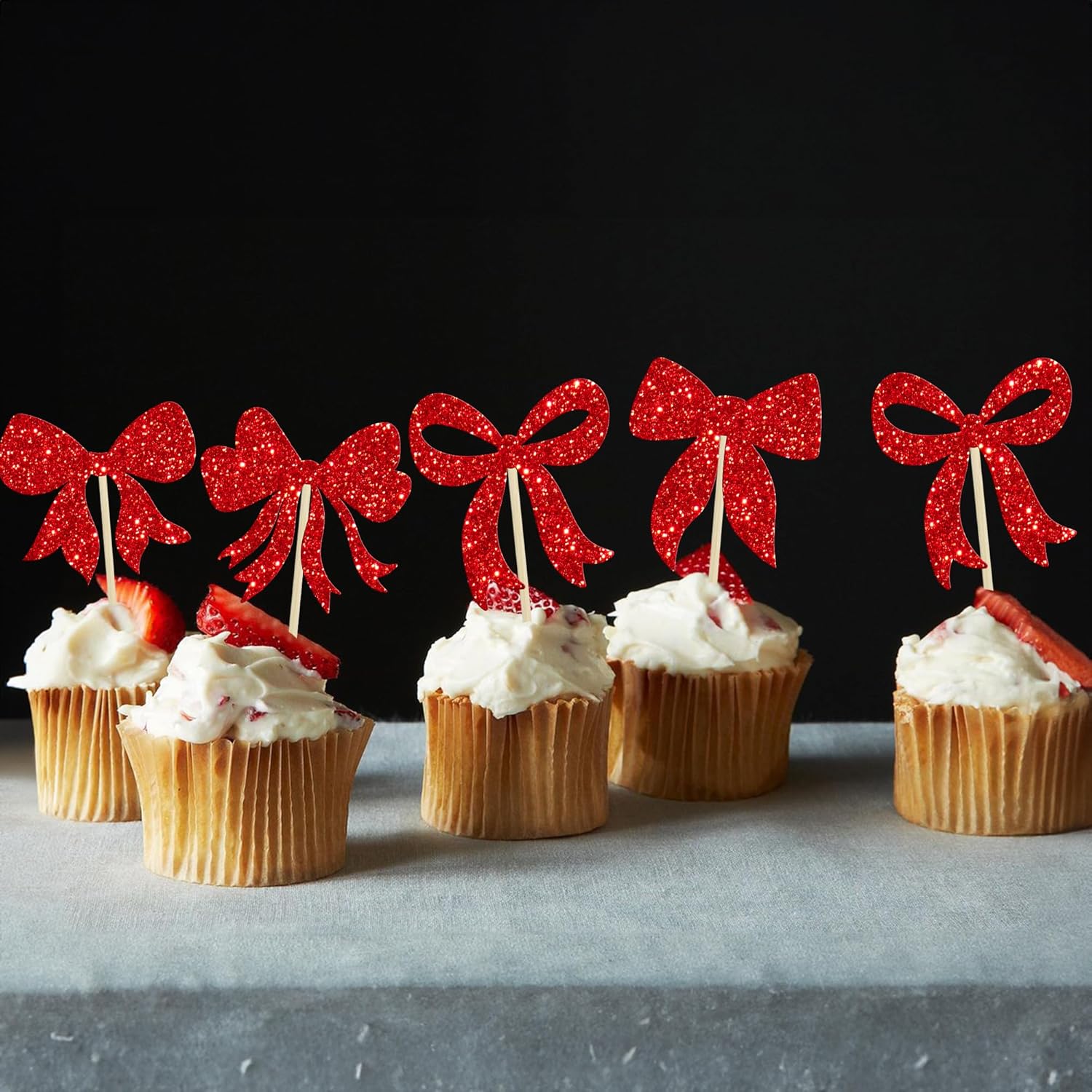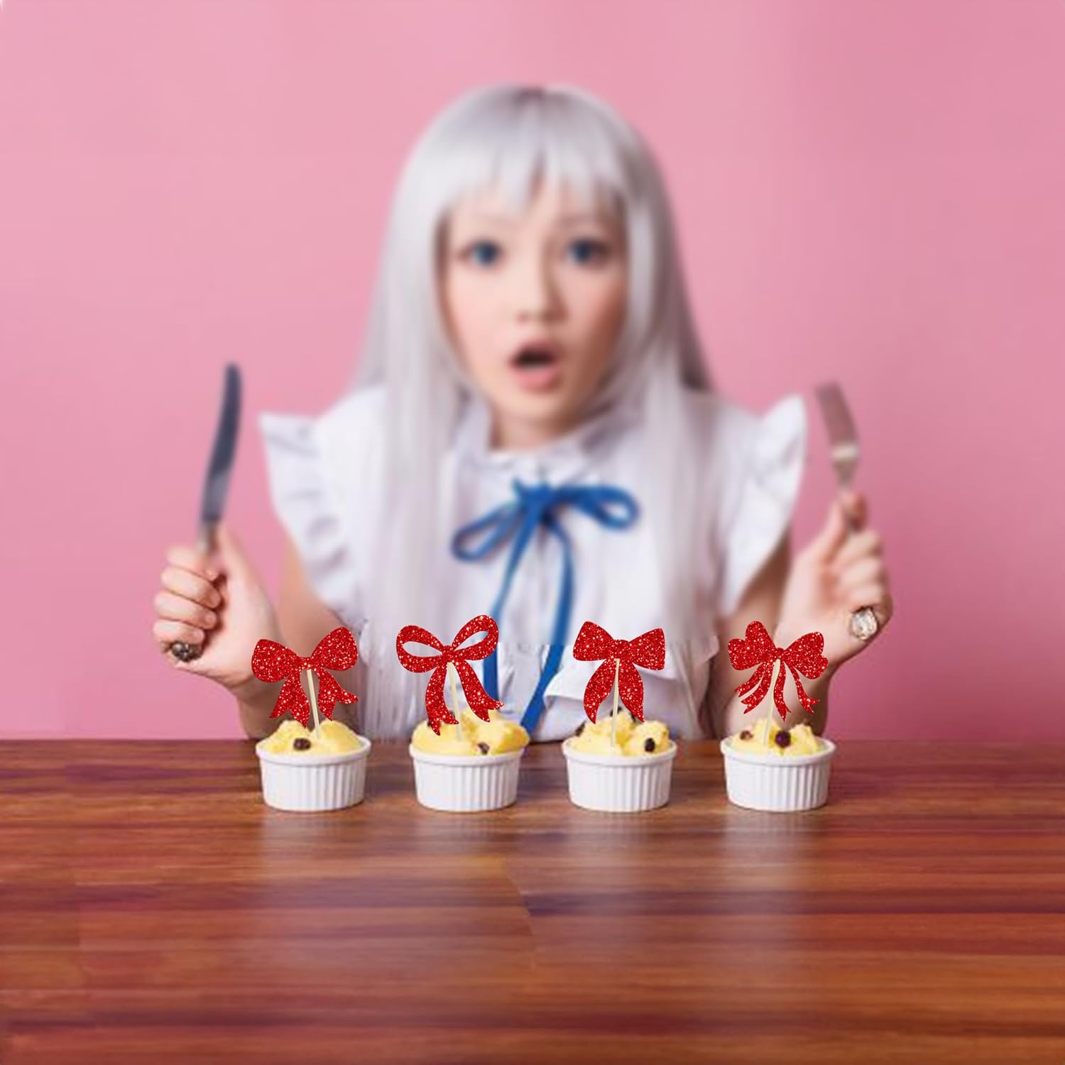 Gyufise 36Pcs Bow Cupcake Toppers Glitter Bowknot Cupcake Picks Bow Tie Birthday Decorations Princess Bow Cupcake Decorations for Bowknot Theme Baby Shower Birthday Party Supplies Red