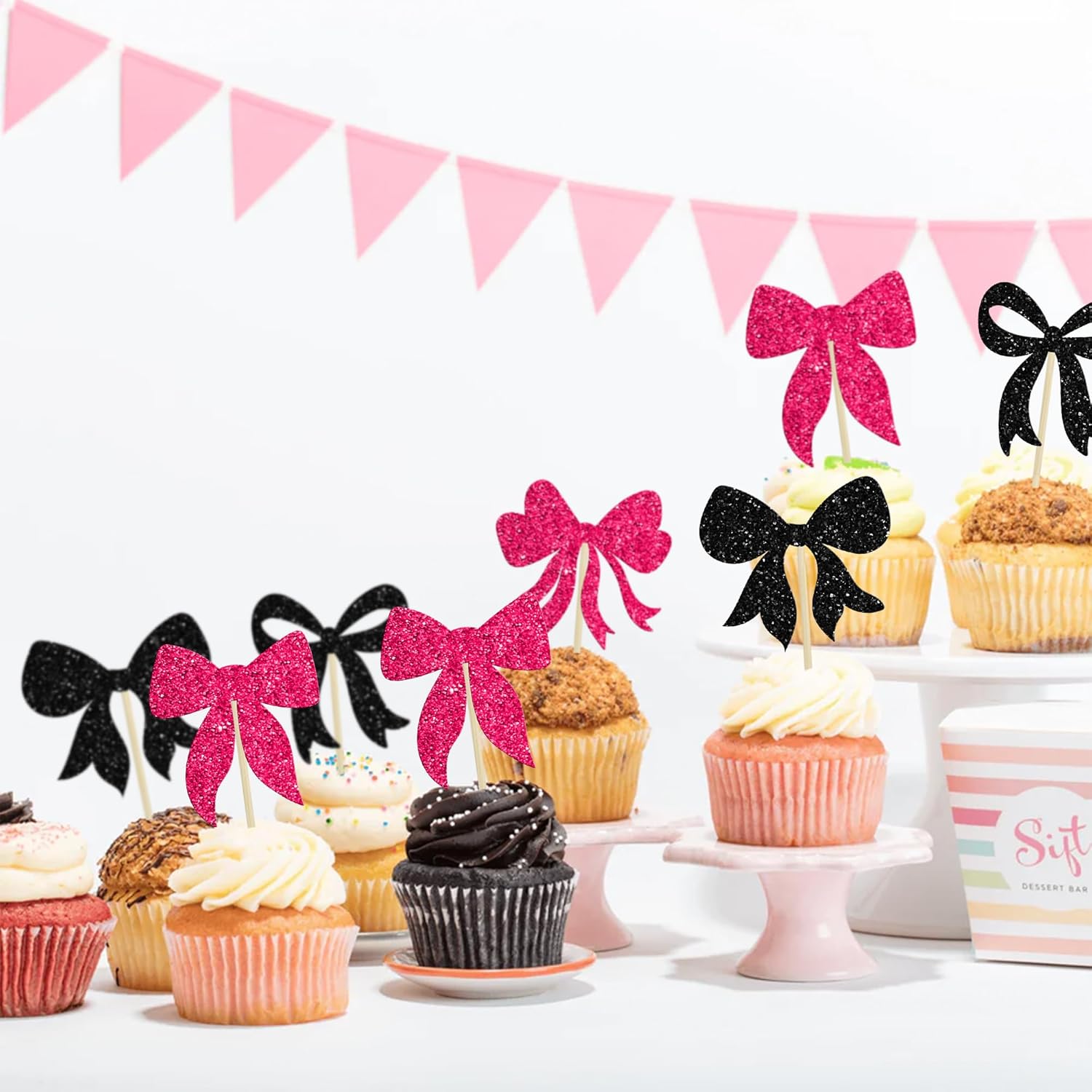 Gyufise 36Pcs Bow Cupcake Toppers Glitter Bowknot Cupcake Picks Bow Tie Birthday Decorations Bow Cake Toppers for Bridal Baby Shower Bachelorette Party Supplies Black Rose Red