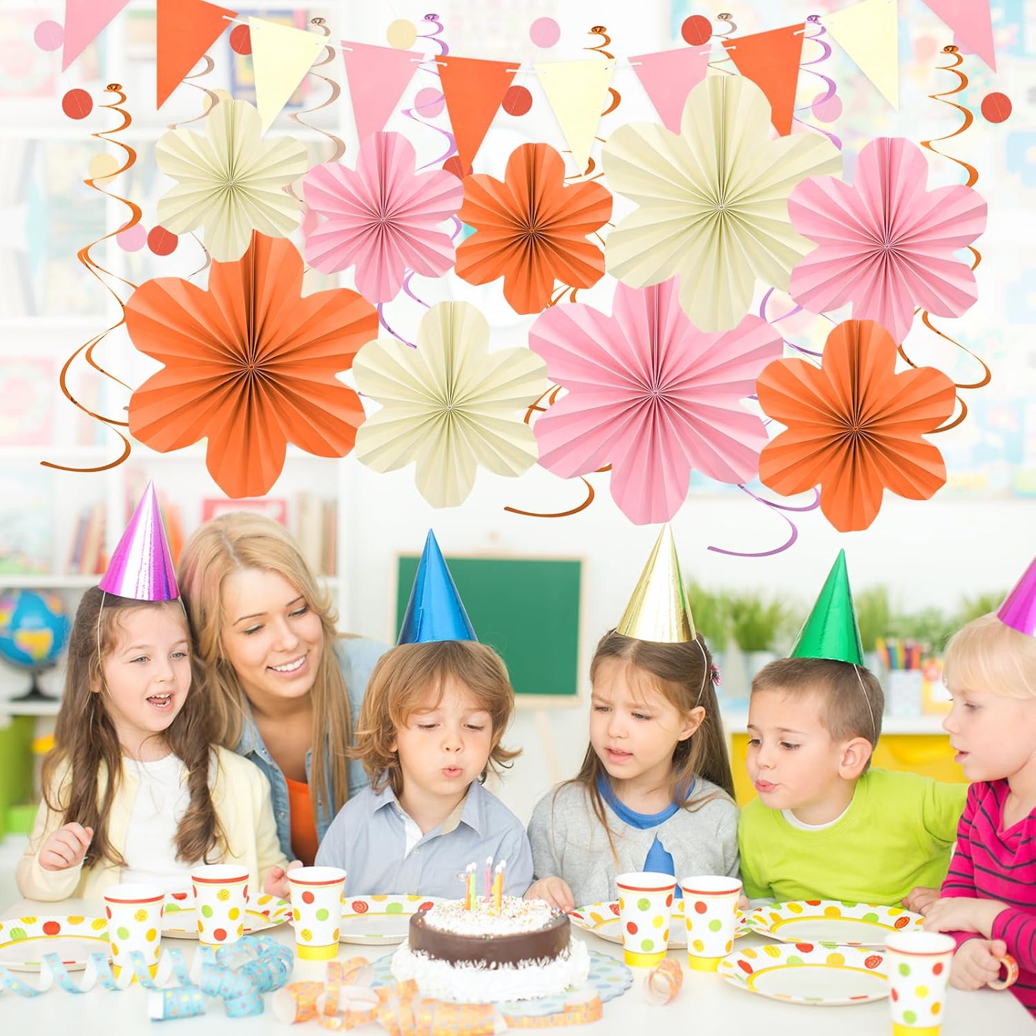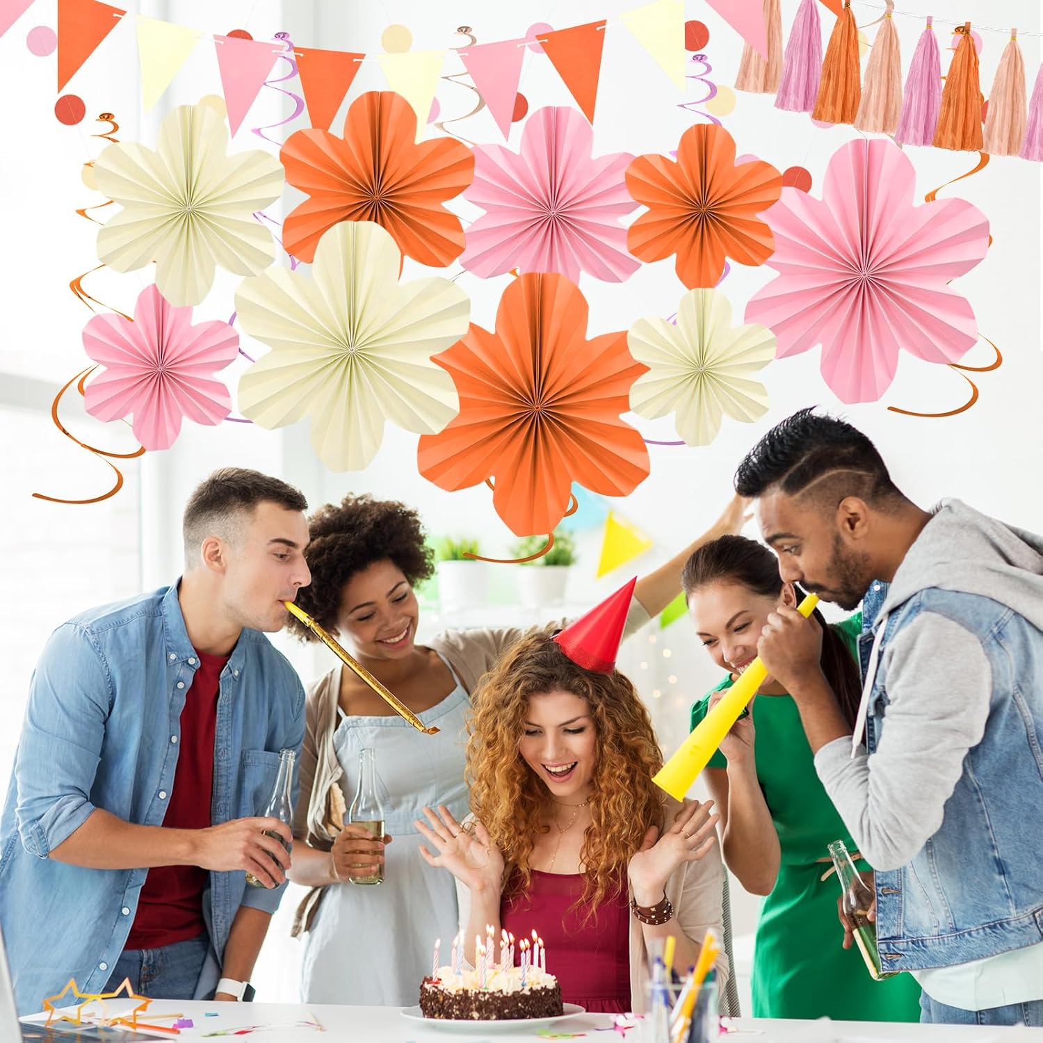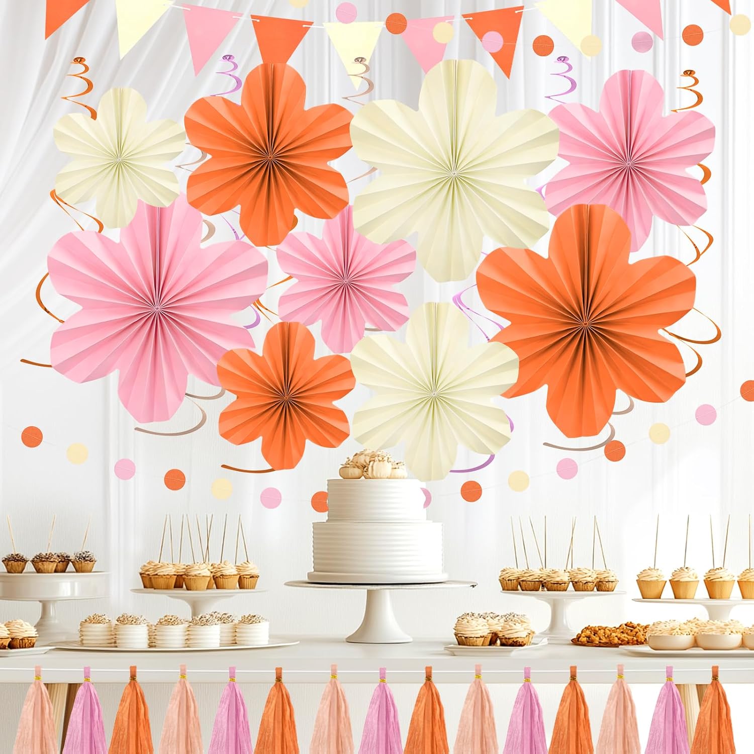 - Orange Party Decorations: Our pink and orange paper fans decorations kit includes 3 pcs 12ββ paper flowers, 3 pcs 10ββ paper flowers, 3 pcs 8ββ paper flowers, 9 pcs hanging swirls, 1 pcs 6.56ft tasseled garland, 1 pcs 6.56ft triangular pennants, 2 pcs circle dot garland, 2 pcs ribbon.