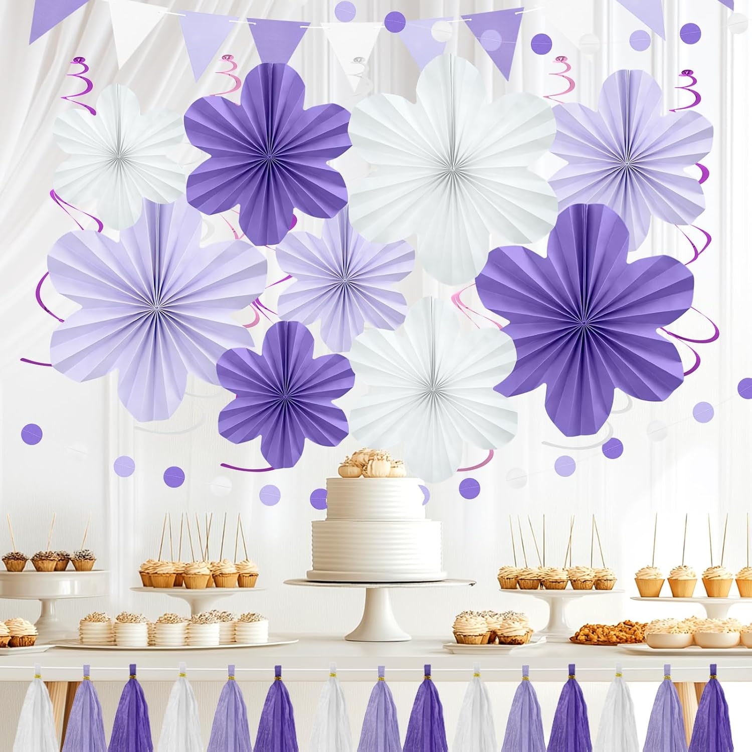 - Lavender Birthday Party Decorations: Our purple and white paper fans decorations kit includes 3 pcs 12ββ paper flowers, 3 pcs 10ββ paper flowers, 3 pcs 8ββ paper flowers, 9 pcs hanging swirls, 1 pcs 6.56ft tasseled garland, 1 pcs 6.56ft triangular pennants, 2 pcs circle dot garland, 2 pcs ribbon.