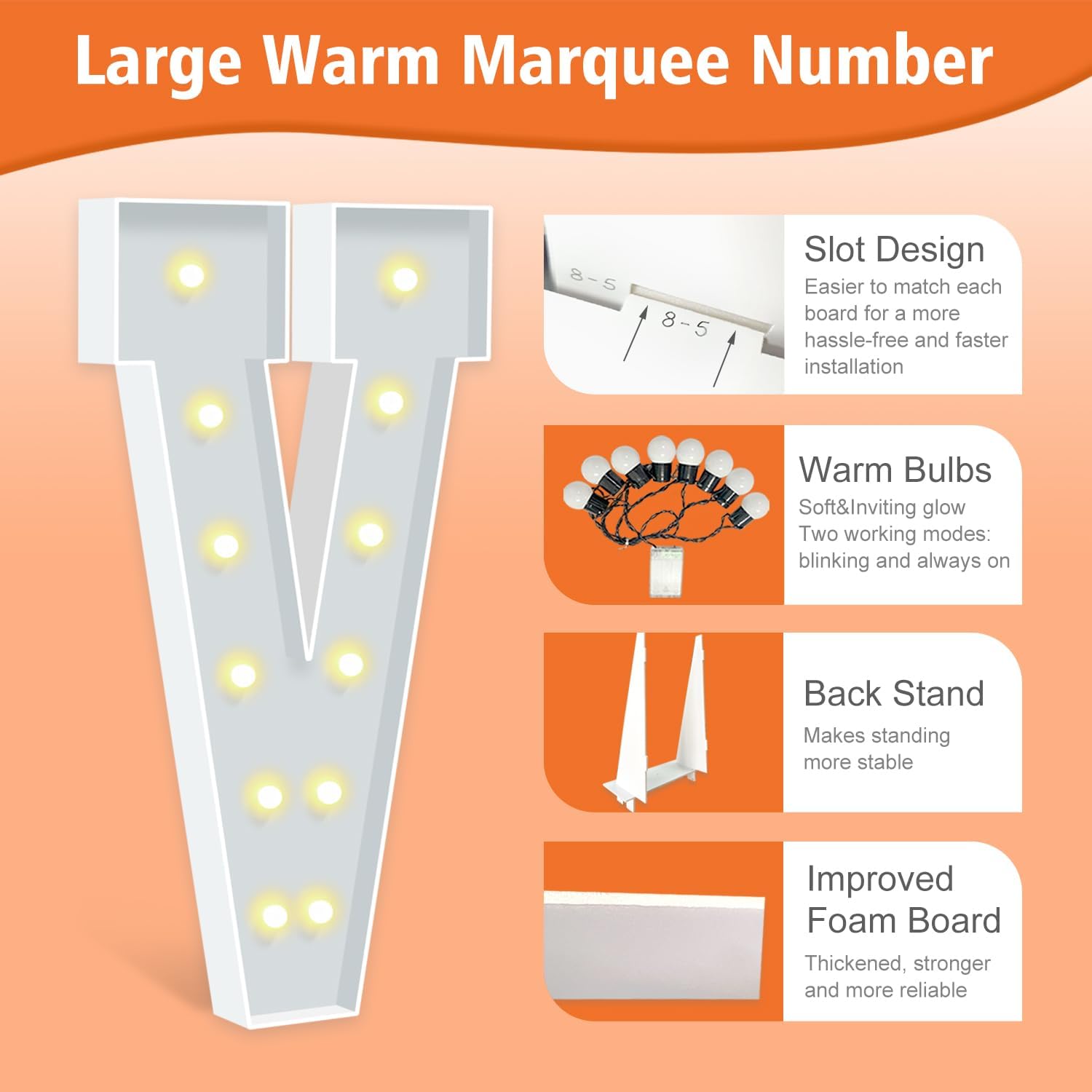 - IMPROVED FOAM BOARDS: Our marquee letters are made from high-density thickened foam boards, the slots and connectors can be tightly linked togethe for better stability. Each letter has a sturdy back stand to ensure that your party marquee sign will not tip over. (Tips: When outdoors, please place something heavy on the back stand to prevent the letter sign from blowing over).