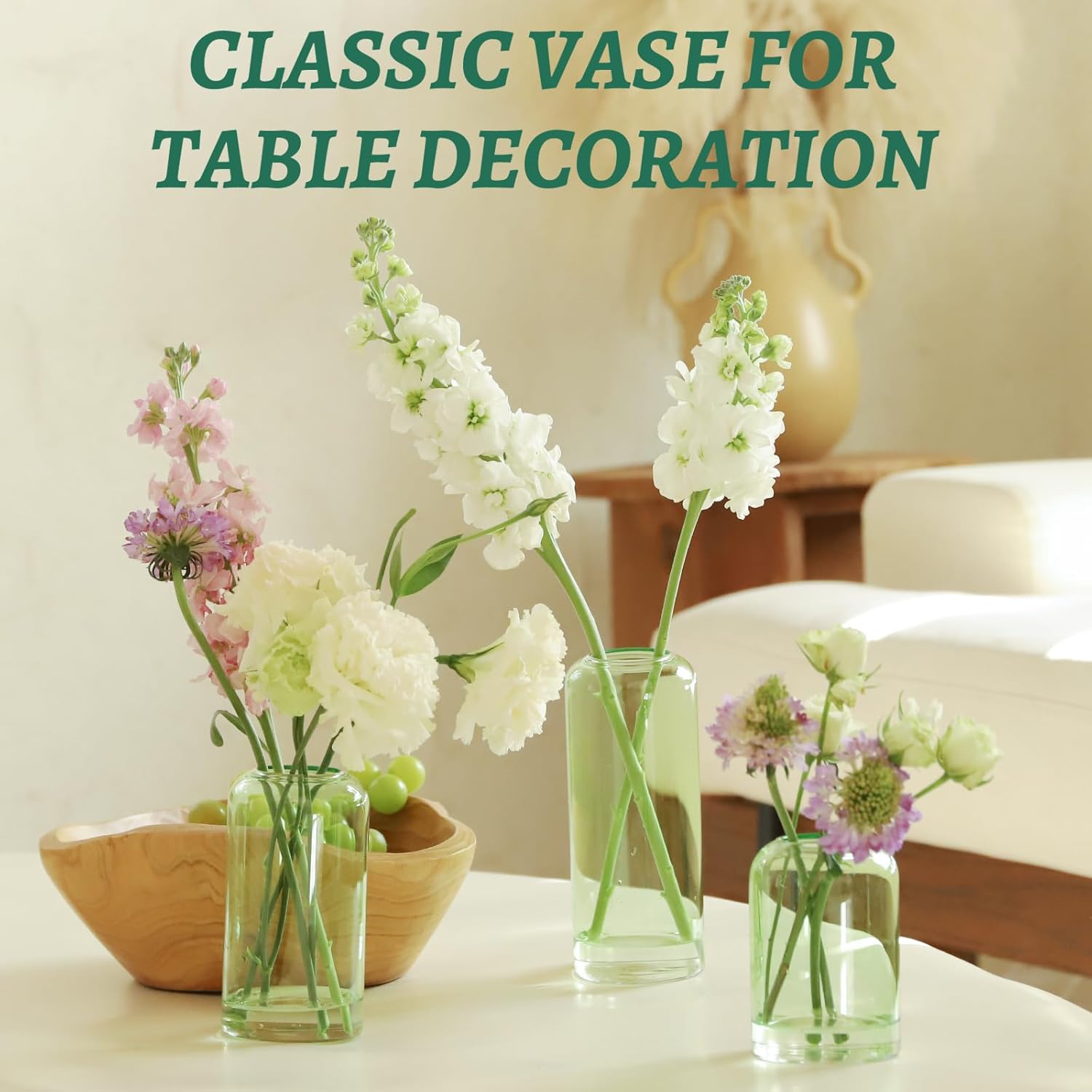 - Quality & Safety: Green glass bud vases is made of selected premium thick borosilicate glassοΌhand-blown to a bright and high transparent finish with durable and sturdy. The top of the vase is smooth with no sharp edges, ensuring safety during the flower arrangement process. Note: Remember to add an appropriate amount of water according to the quantity and weight of the flowers for stability.