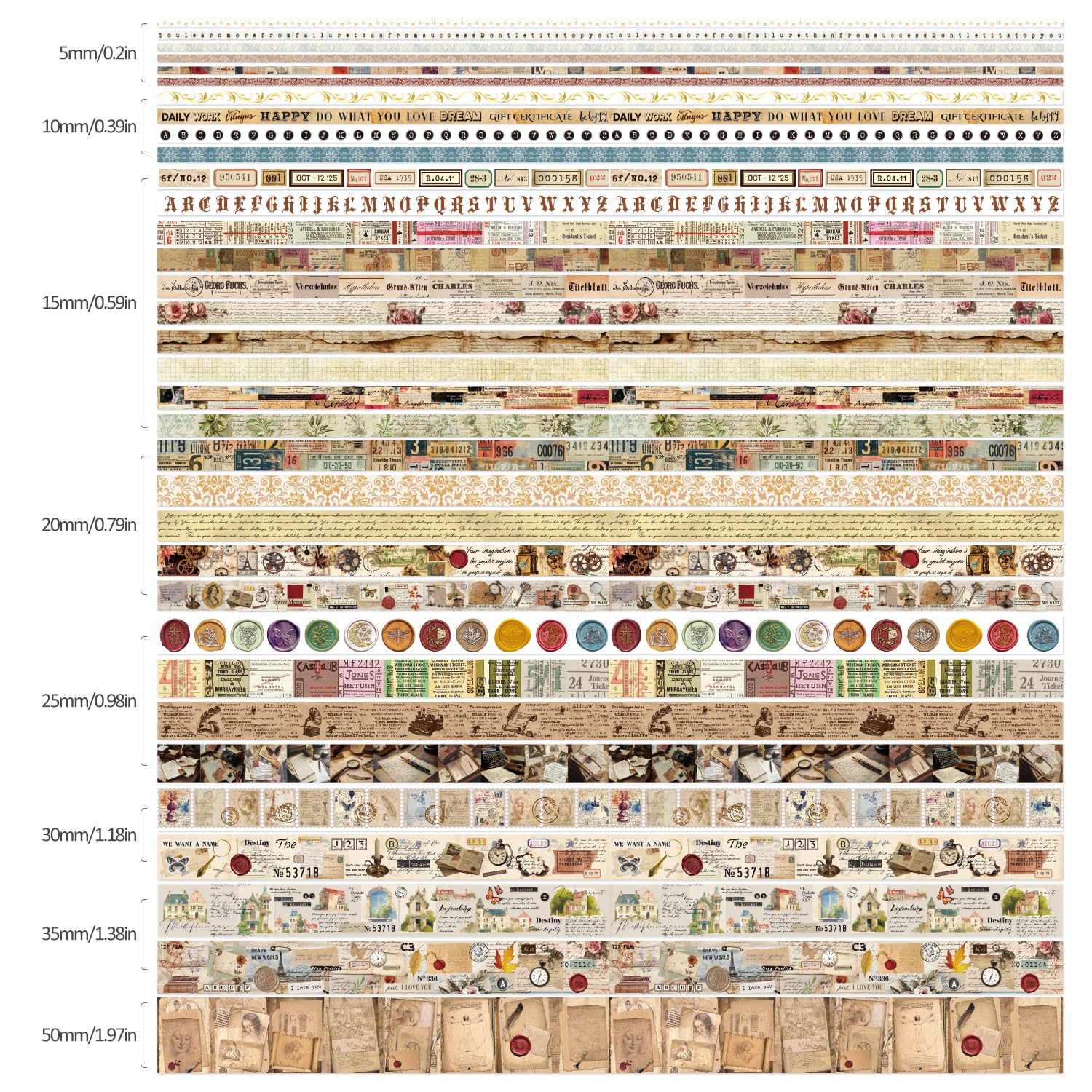 - 34 Rolls Washi Tape,1.97 inch(50mm) wide x 1 tape ; 1.38 inch (35mm) wide x 2 tapes ; 1.18 inch (30mm) wide x 2 tapes ; 0.98 inch(25 mm) wide x 4 tapes; 0.79 inch(20 mm) wide x 5 tapes; 0.59 inch (15mm) wide x 10 tapes; 0.39 inch (10mm) wide x 4 tapes;0.19 inch (5mm) wide x 6 tapes;These different series and sufficient quantity washi paper stickers can meet your daily use and replacement.