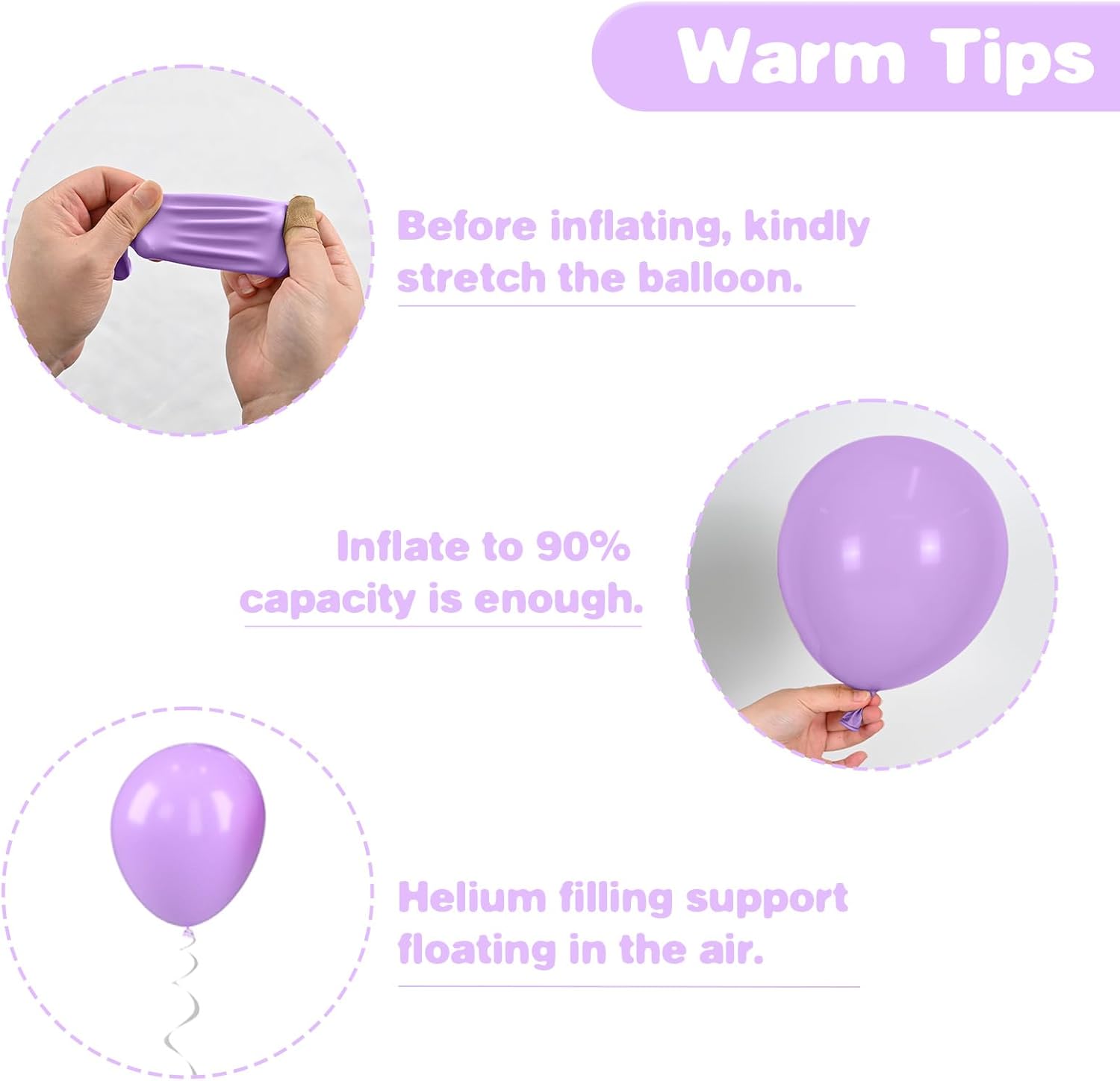 - Friendly Reminders: After inflating, you may notice the balloon colors appear lighter, and lighting can also affect their appearance. To keep them looking their best, avoid sharp objects, rough surfaces, and direct sunlight. Store any unused balloons in a cool, dry place to maintain their quality. If you have any questions, please feel free to reach out!