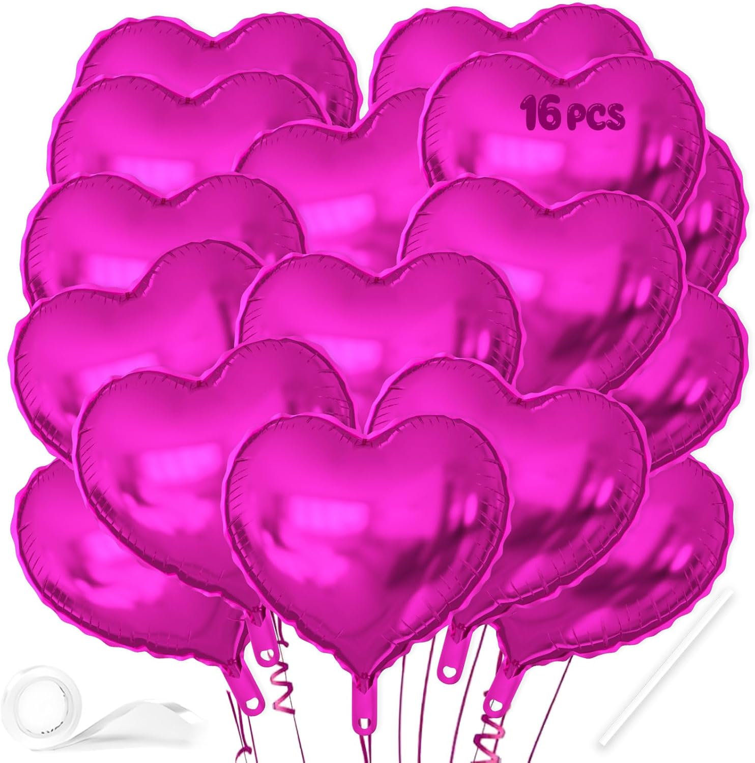 16 Pcs Heart Balloons, 18 Inch Hot Pink Love Heart Shaped Foil Balloons for Wedding Anniversary Birthday Party Valentine Decorations Baby Shower Bridal Shower Engagement Decorations Supplies