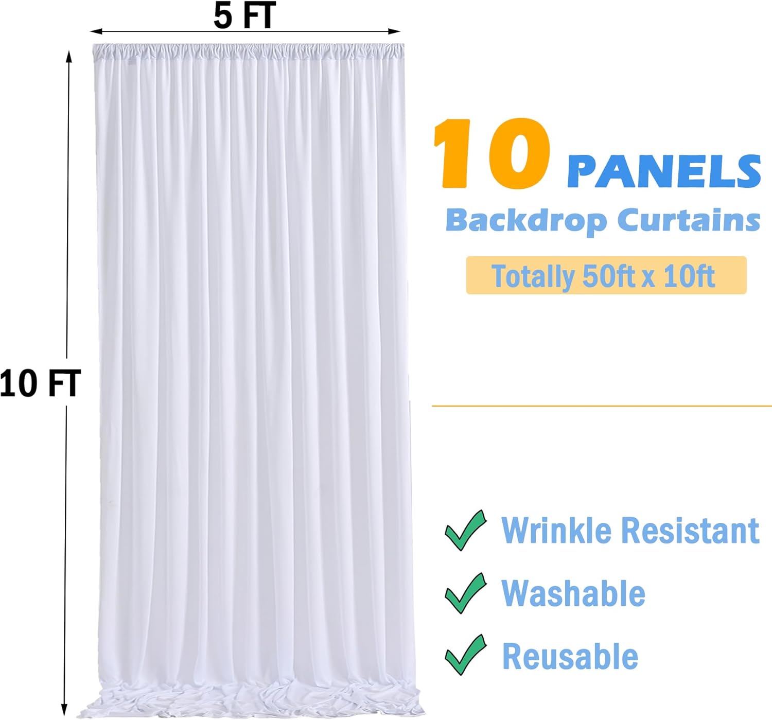 50ftx10ft Wrinkle Free White Backdrop Curtain for Party Background, 10 Panels Silky Polyester Photo Backdrop Drapes Back Drop Cloth for Wedding Birthday Photography Baby Shower Photoshoot Decor