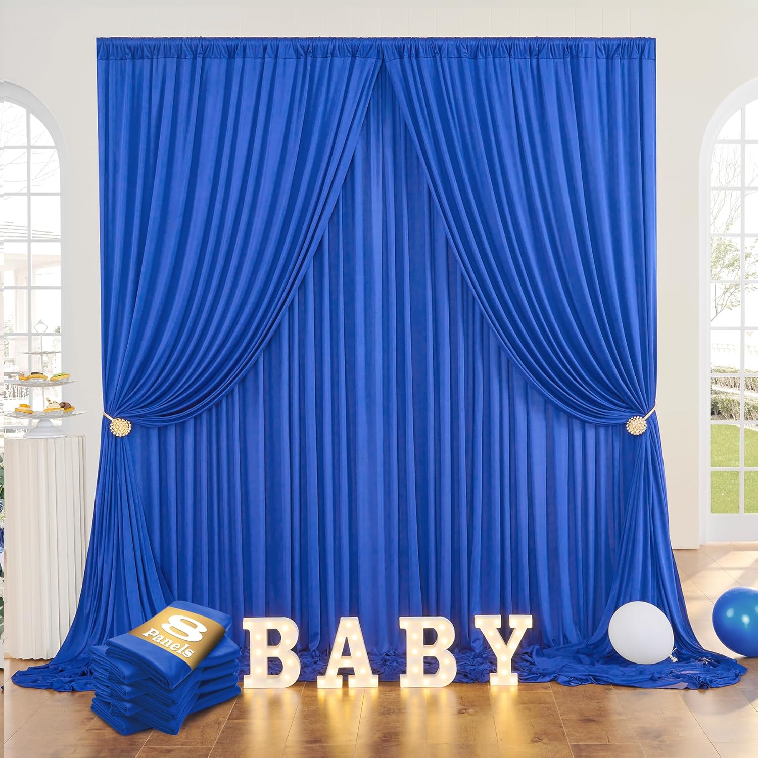 - 10ft Fabric Drape royal blue Backdrop Curtain Wide Compatibility: Polyester photo drape blue backdrop curtain can be used for parties, baby shower, wedding, birthday party, photography, bridal shower, gender reveal, zoom, princess party, engagement party, baptism, candy buffets, dessert table, sweet table, background, photo booths, photoshoot, ceremony, anniversary, graduation, home decorations, holiday party, stage curtain or just to mask unsightly areas