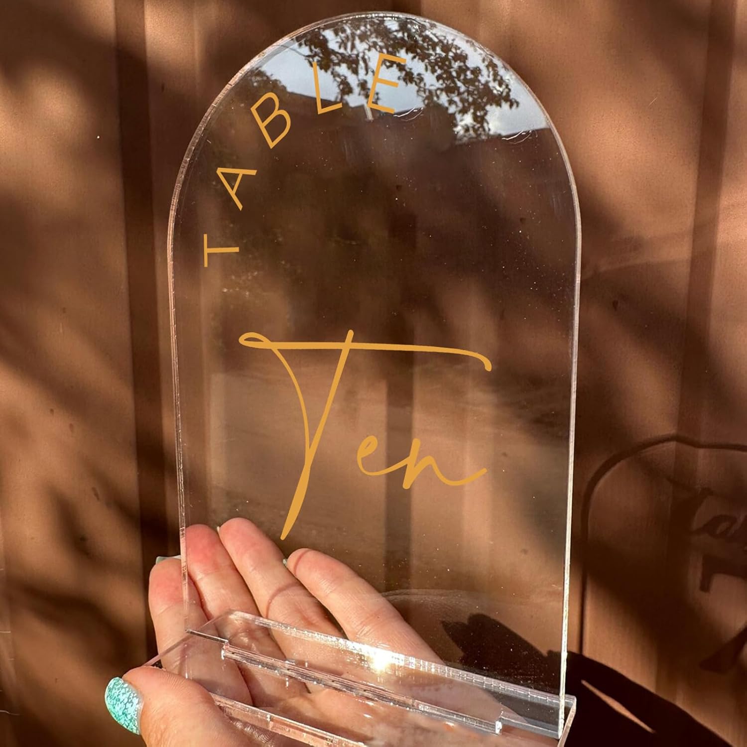 - SIMPLE & ELEGENT DESIGN: These modern minimalistic clear arch table numbers are the perfect touch to add to your wedding. We love the sleek, clean lines of these clear arch acrylic table numbers, they are a beautiful wedding table numbers, perfect for displaying on tabletop centerpiece.