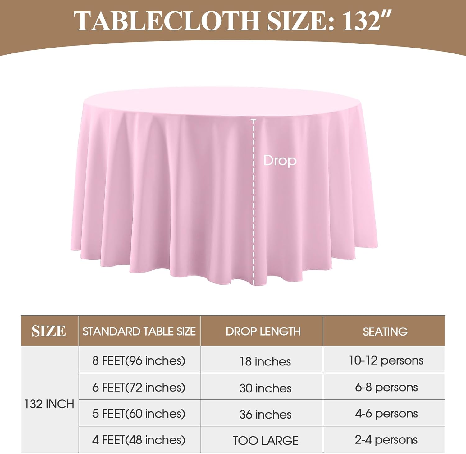 - Suitable Size: This polyester round tablecloth has multiple sizes to choose from, 90, 108, 120, 132 inches, which can meet the needs of tables of different sizes. In order to buy a tablecloth that is more suitable for your table, please measure the actual size of your table before purchasing and refer to our size chart