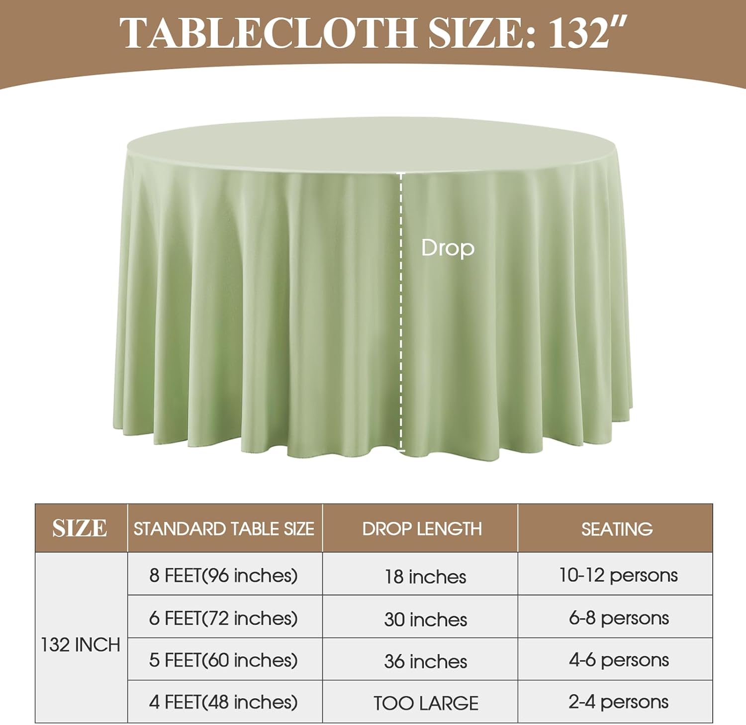 - Suitable Size: This polyester round tablecloth has multiple sizes to choose from, 90, 108, 120, 132 inches, which can meet the needs of tables of different sizes. In order to buy a tablecloth that is more suitable for your table, please measure the actual size of your table before purchasing and refer to our size chart