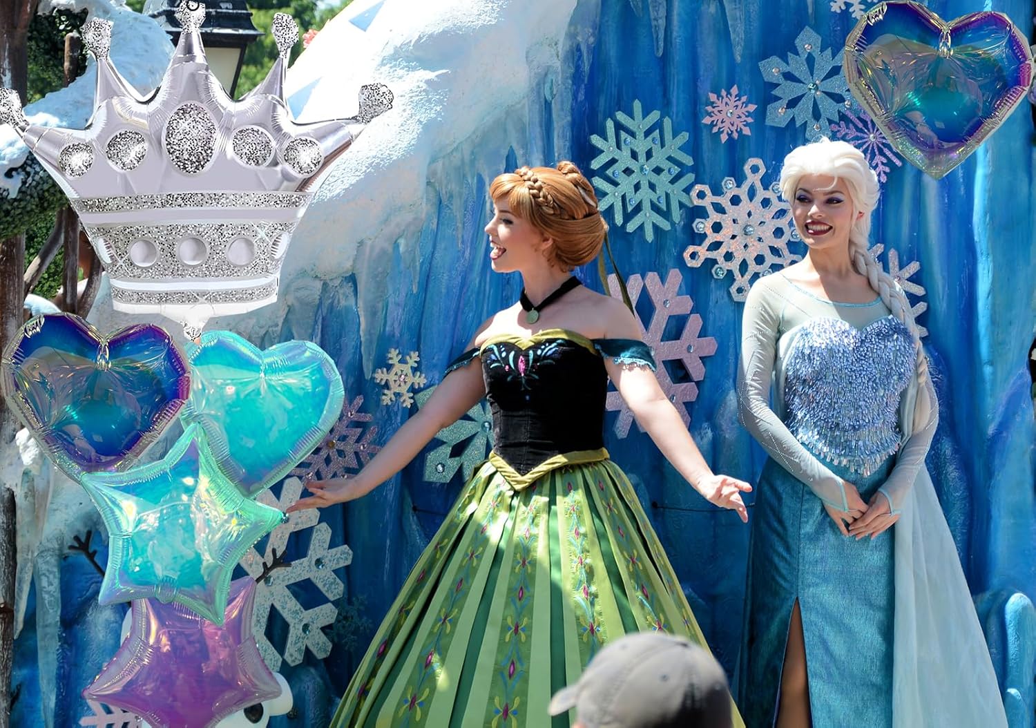 - BALLOON SET: Includes a large silver glitter crown balloon which can support helium,and multiple iridescent heart and star shaped foil balloons in mesmerizing holographic blue tones which can only blow with air.