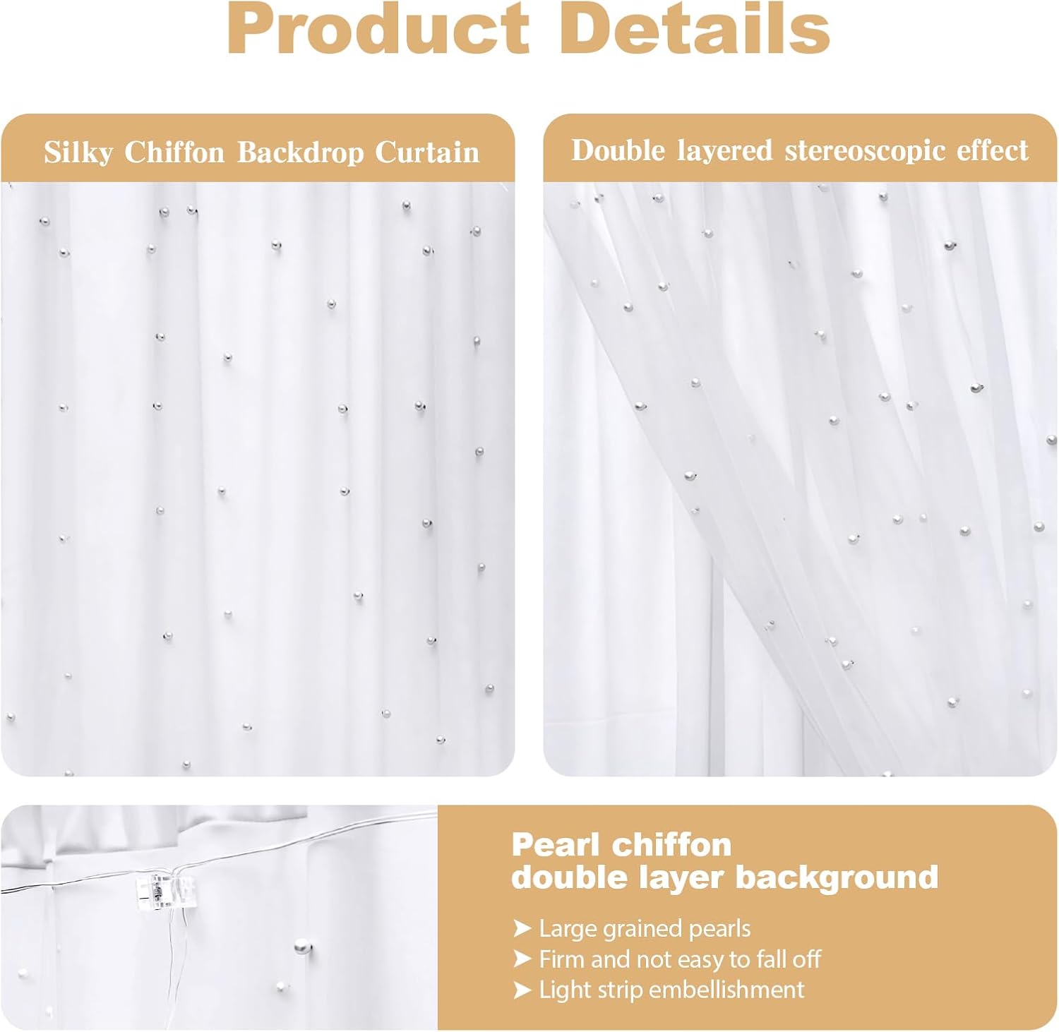 - Material: This is a set of double-layered backdrop curtains, which are composed of two layers: pearl tulle and white lining. The pearl tulle exudes romance and beauty, while the white lining is designed to be opaque.