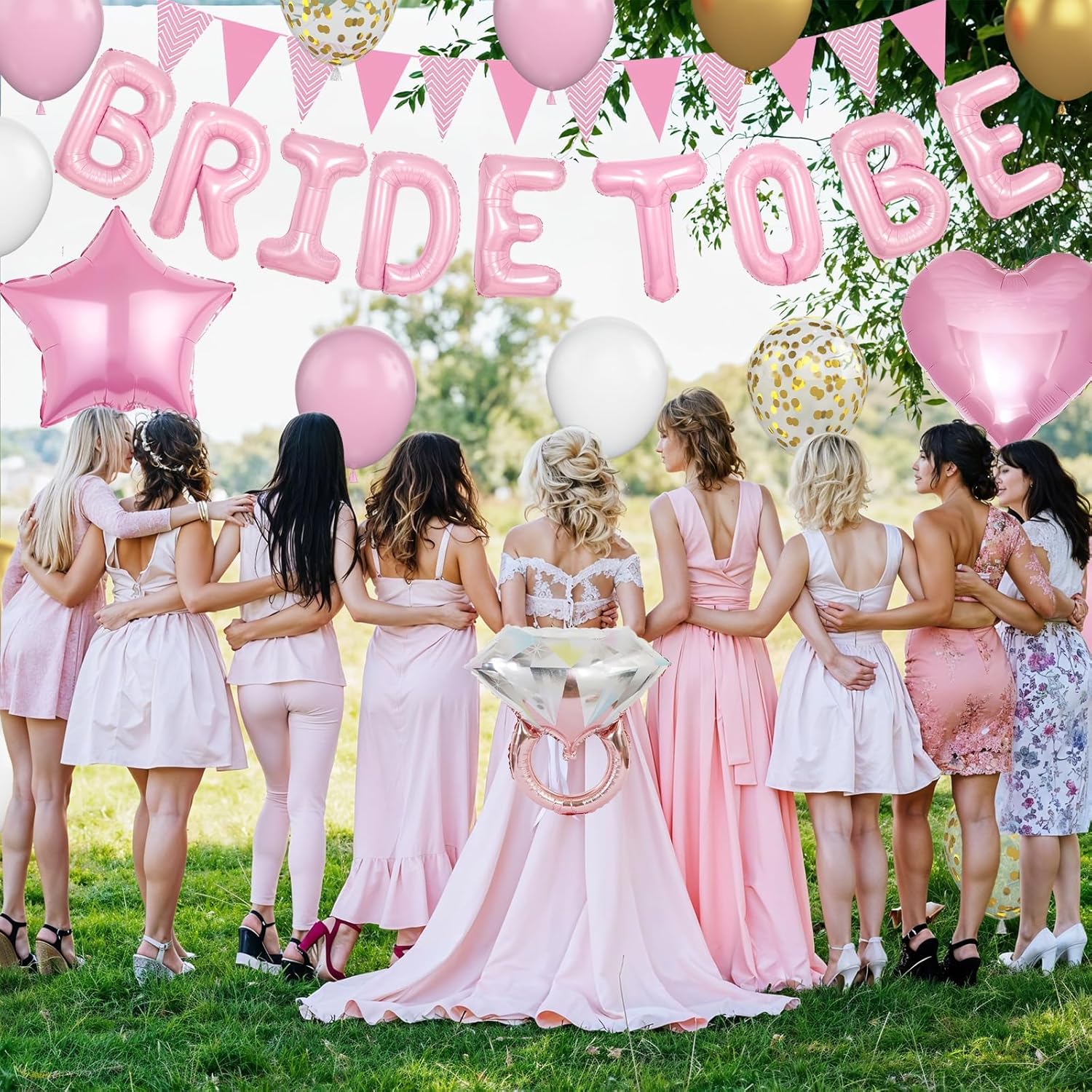 - Bachelorette Party Decorations: The pink bachelorette party decorations includes pink "BRIDE TO BE" letters balloons, pink foil balloons (star, heart)x 1, 12inch latex balloons (pink x 5, white x 4, metallic gold x 3, gold confetti x 3), diamond ring balloon x 1, pink banner x 1, glue point x 20, balloon ribbon x 1. Pink and gold wedding decorations can be used as background decorations for the bride and friends and family.