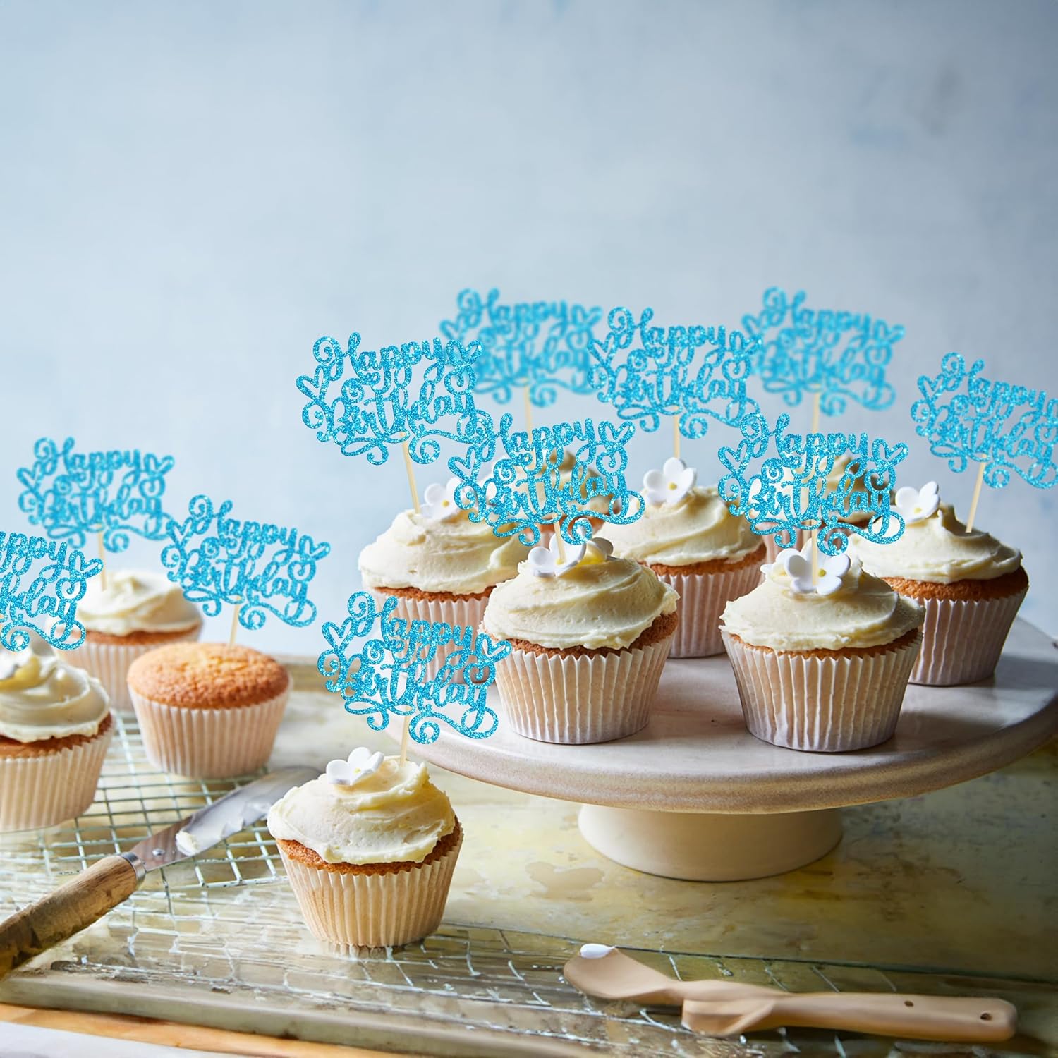 Gyufise 24Pcs Happy Birthday Cupcake Toppers Glitter Happy Birthday Cupcake Picks for Celebrating Happy Birthday Anniversary Theme Party Cake Decorations Supplies Blue