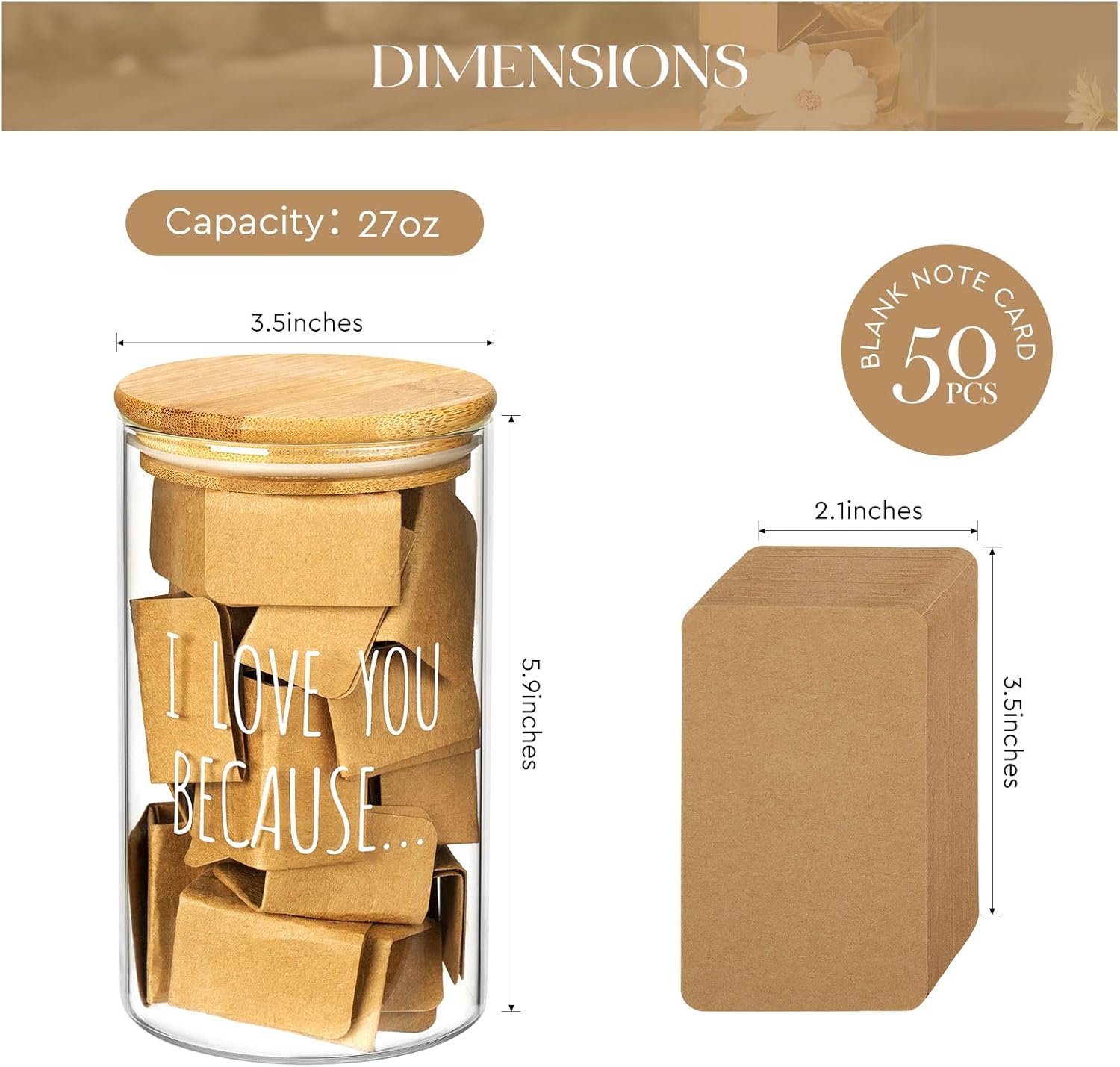 - 50 Reasons Why I Love You Jar: Includes 50 brown blank notes to write memories, love notes & gratitude. Fill it with "reasons I love you"——surprise messages, couple fight resolutions or friendship encouragement