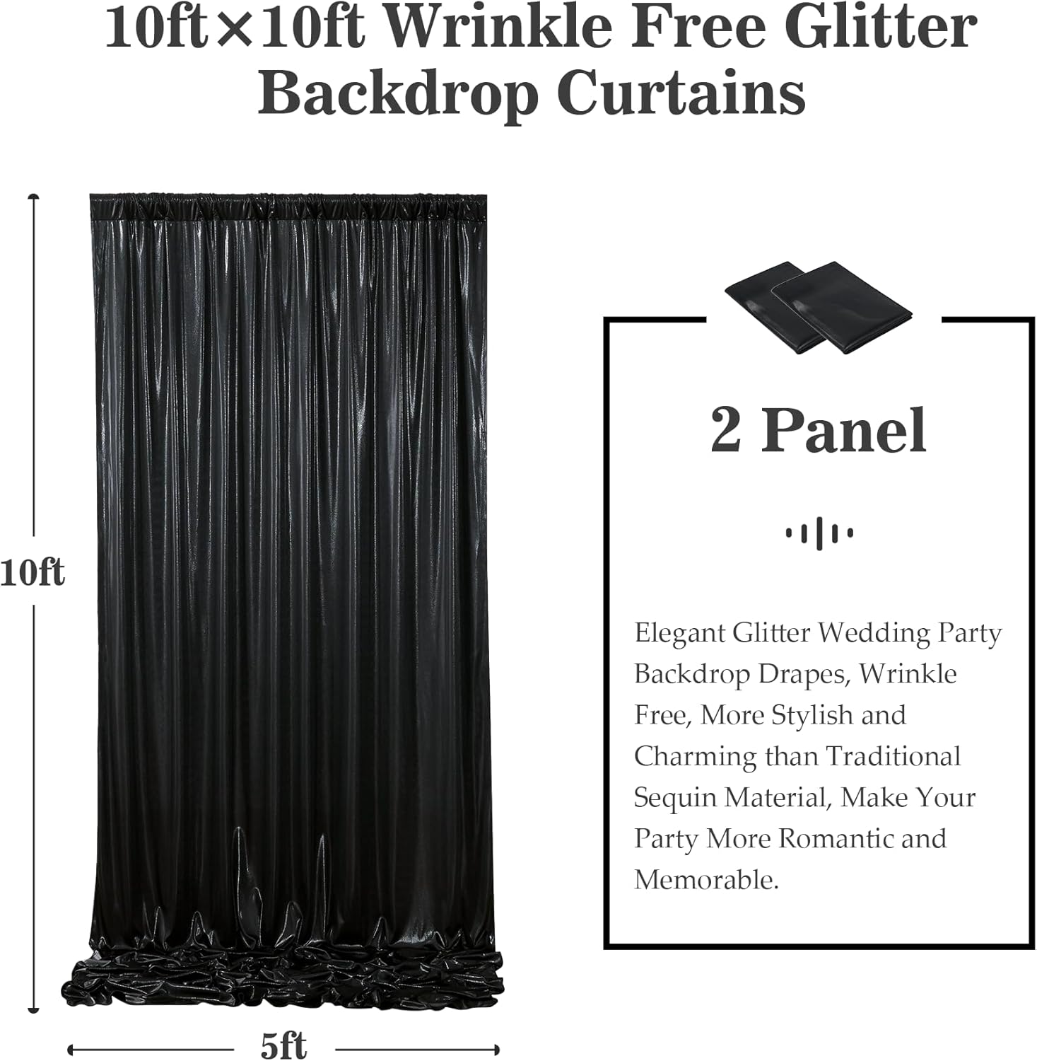 - Wrinkle-Free: Our 10ft Black sequin glitter party background curtain panels are made of wrinkle-free material, which could be used without ironing. Let you make unforgettable memories for your family or your friends.