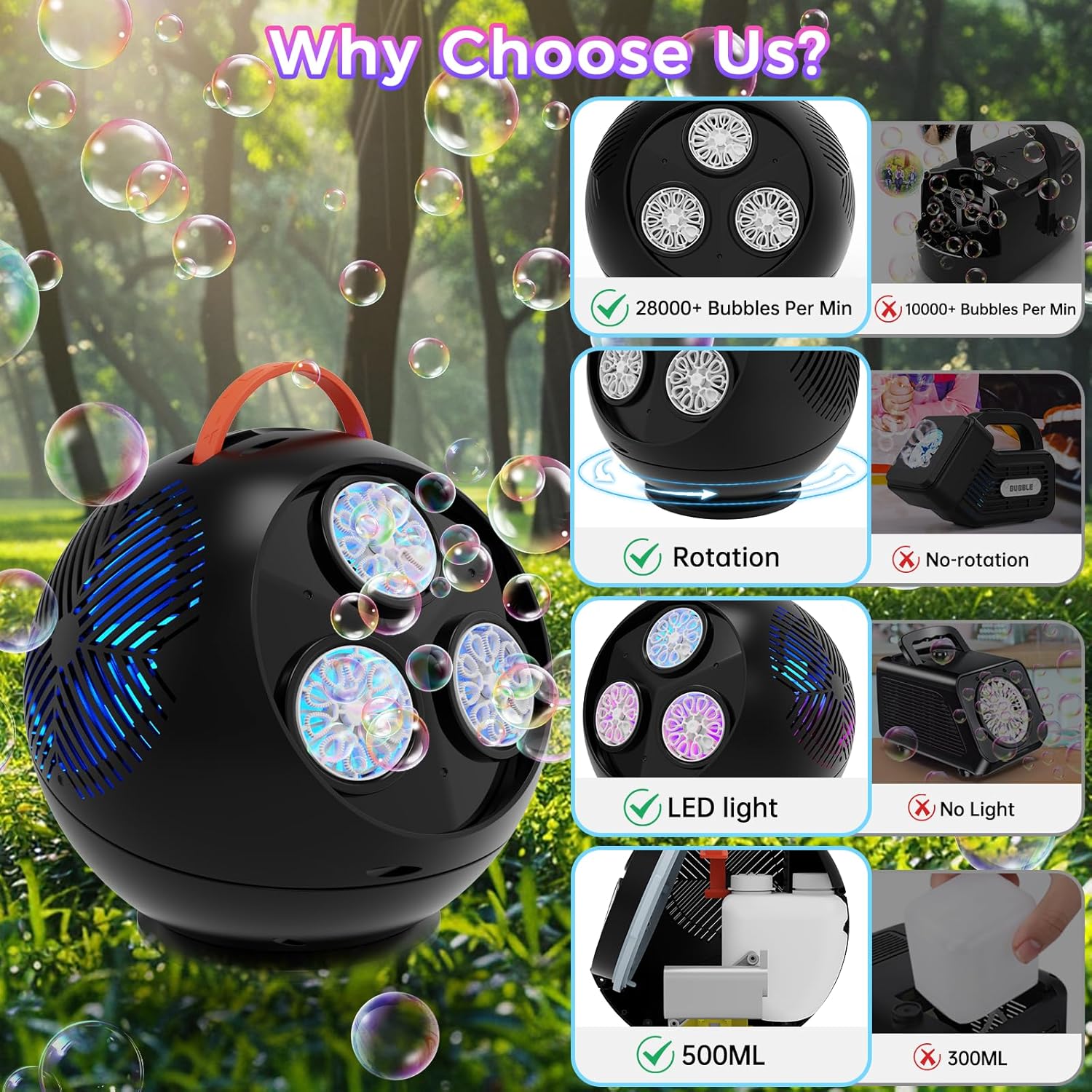 - 360° Rotating LED Bubble Machine: Elevate your bubble experience with our latest design! This spherical bubble machine features 45° and full 360° rotation, creating a mesmerizing cascade of bubbles illuminated by LED lights—perfect for magical nighttime fun. Unlike traditional one-direction bubble machines, this innovative device surrounds you with enchanting bubbles from every angle, delivering endless joy and a dreamy atmosphere.