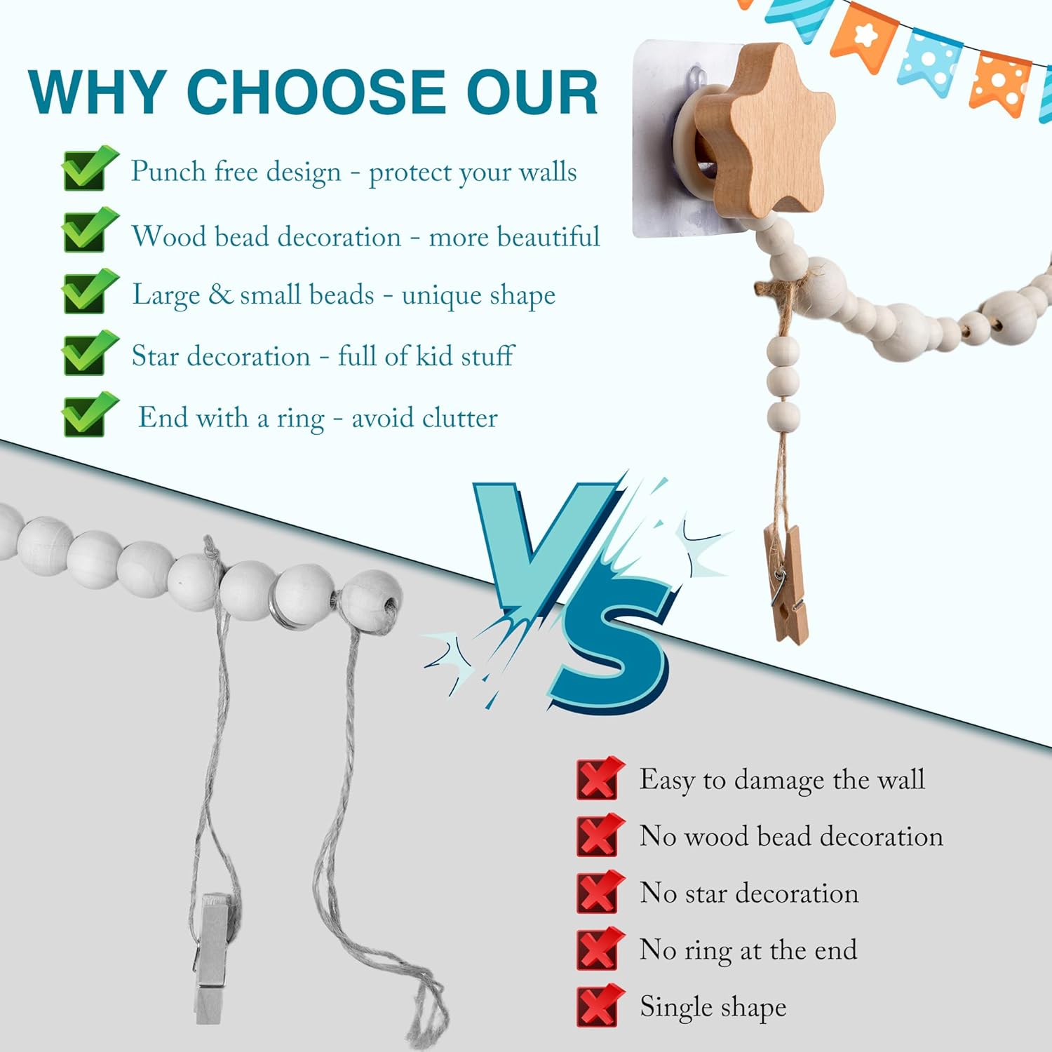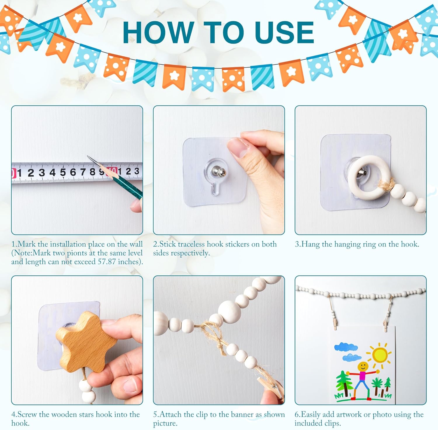 - Package: Total length of wooden bead garland: 59". It is equipped with 40 wooden clips(12 single clips with wooden beads+28 double head clips), 2pcs Wooden stars hook , 2pcs Traceless hook sticker, 2pcs Hardwall hanger garland which can show many children's artworks