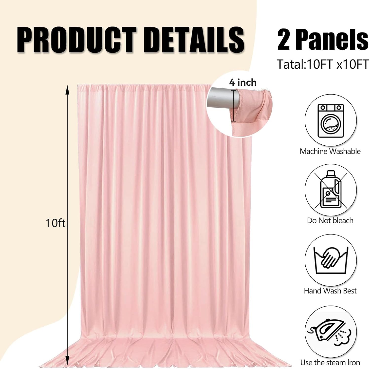 - 【Package Include】Each pack contains 2 panels of fabric shiny satin backdrop curtains. Each backdrop measures 10 feet x 10 feet (60 inches x 120 inches). There is a rod pocket designed on the top of the curtain, allowing you to easily hang it on a pipe or background stand. Tips: ONLY the backdrop curtains, no include a stand.