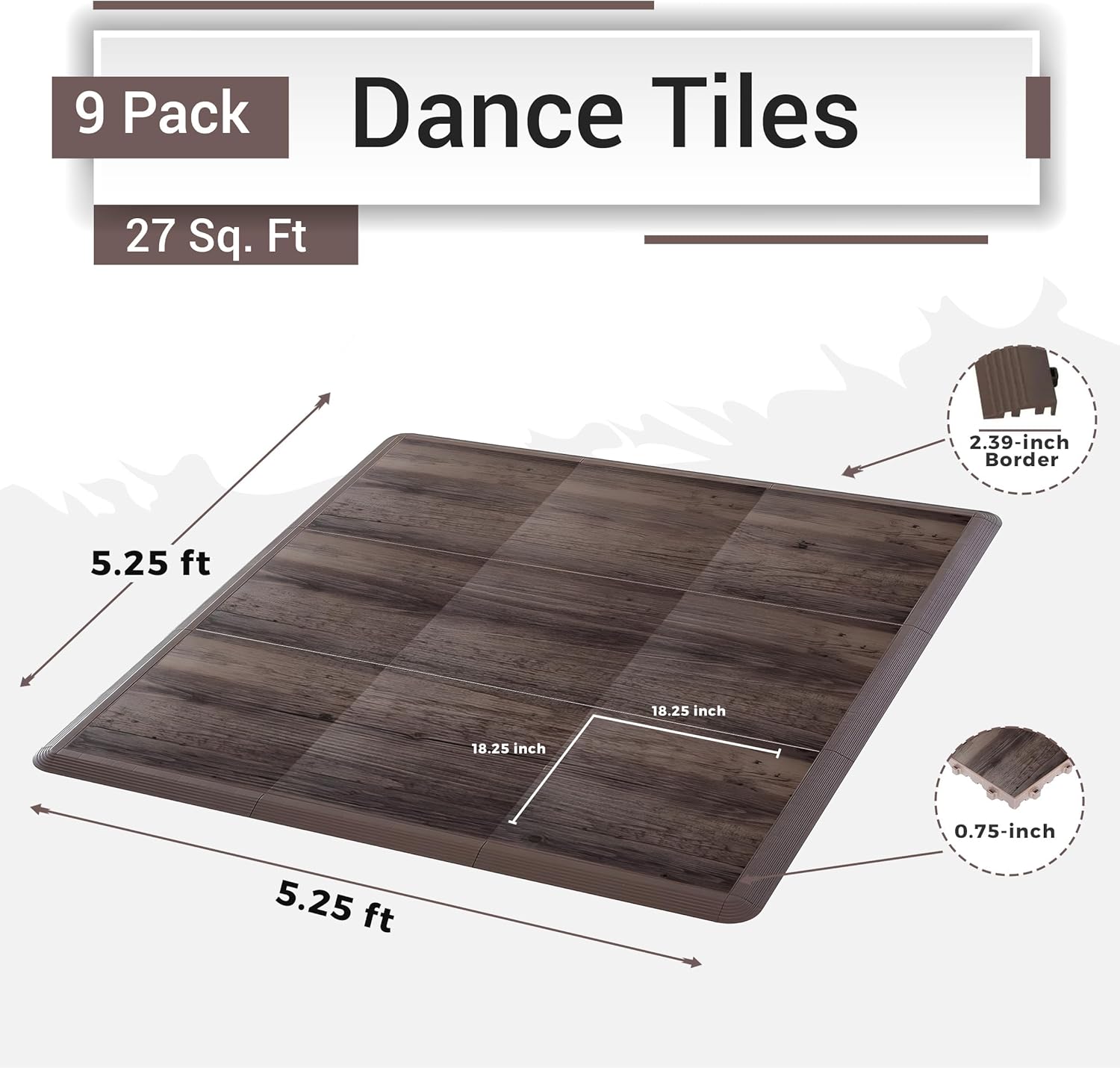 - Seamless Interlocking System: Each tile measures 18.25" x 18.25" with a sturdy 2.39-inch border and 0.75-inch thickness. These tiles securely interlock to create a smooth, gap-free surface, ensuring safety and stability during practice or performances