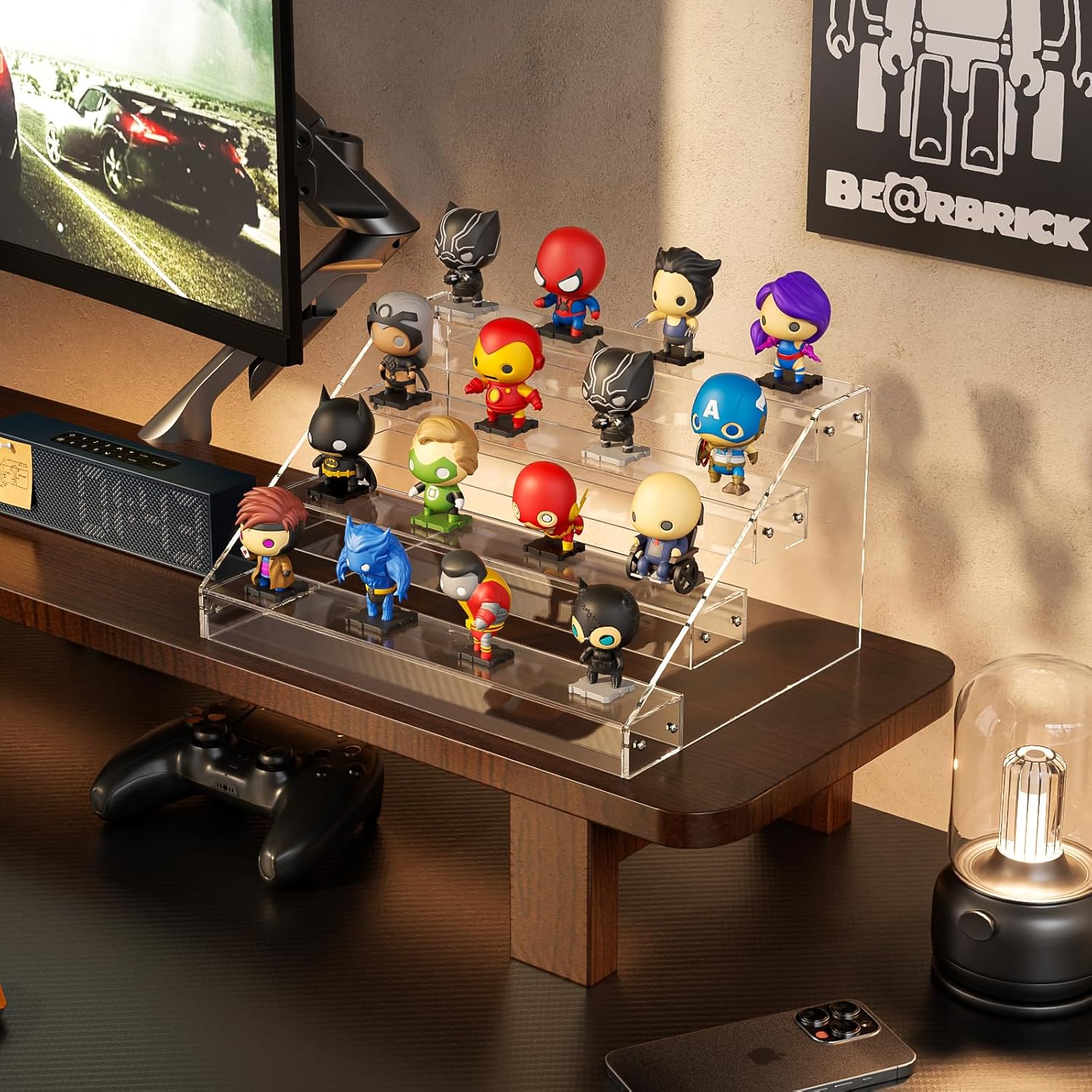 - 【Multi-layer Design】: This sticker display stand for display is designed with 4 layers, it adopts a new concave-convex double-sided design, and the slats can be used both front and back. The flat side is perfect for displaying various figurines and toys as well as perfume and cosmetics in a large size.The concave surface can better display all kinds of standard size cosmetics and perfumes. It prevents items from bumping and falling when picked up.