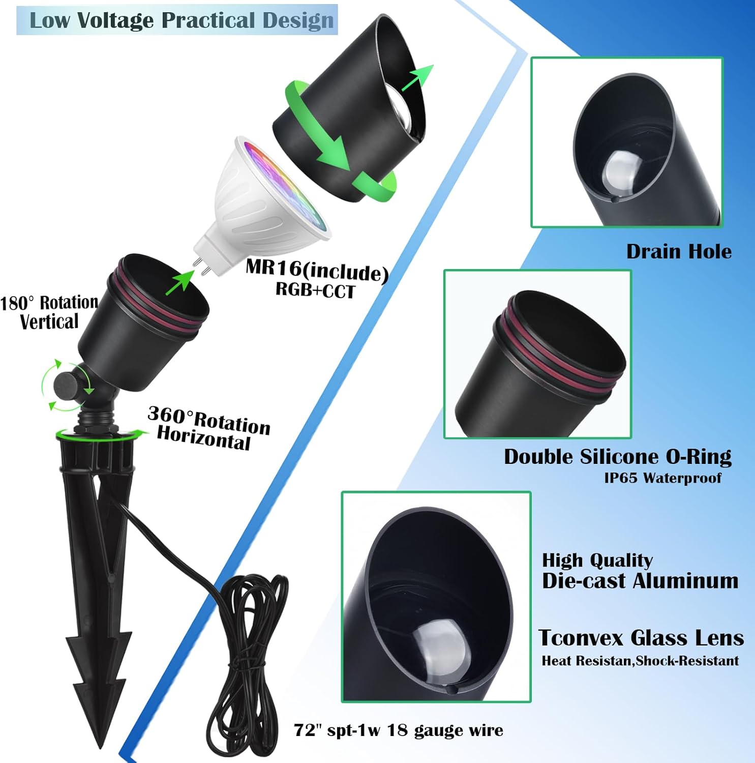 - 1.RGB & Tunable White Light: Bring your outdoor space to life with 16 million color options and warm to cool white. Whether highlighting your garden, pathways, or patio, easily adjust the low voltage 12V landscape lighting to create captivating effects for any occasion. From vibrant parties to relaxing evenings, these lights offer endless customization for the perfect atmosphere.
