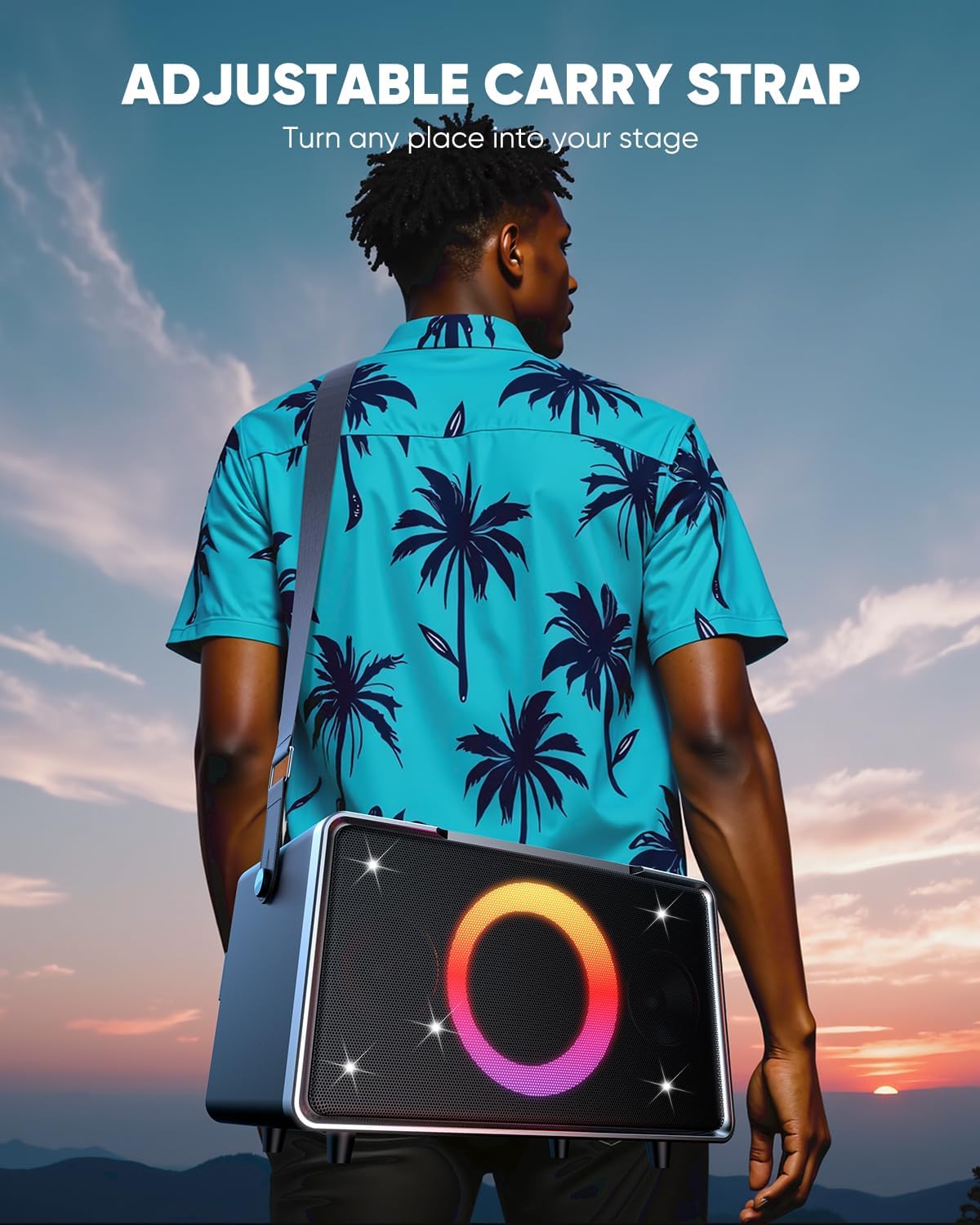- PORTABLE REMOVABLE SHOULDER STRAP: Just sling it over your shoulder—toss the portable speaker into your pickup or carry it to the beach. Wherever you go, booming beats follow as your portable companion.