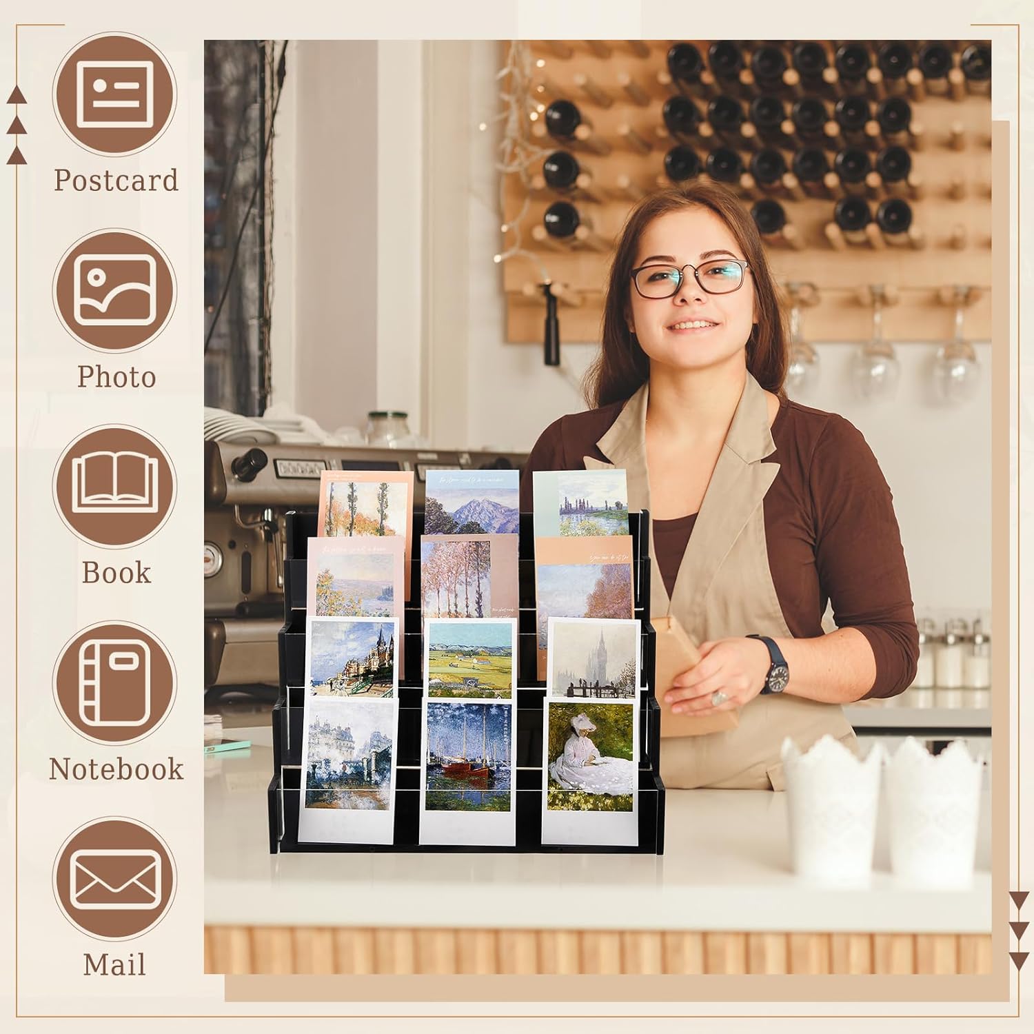 - Impressive Dimensions: our greeting card display stand boasts an overall size of about 14.96 x 12.2 x 8.27 inches, providing an ideal fit on your counter's pace; Each of its 4 tiers are about 2.8 inches high and 2 inches wide