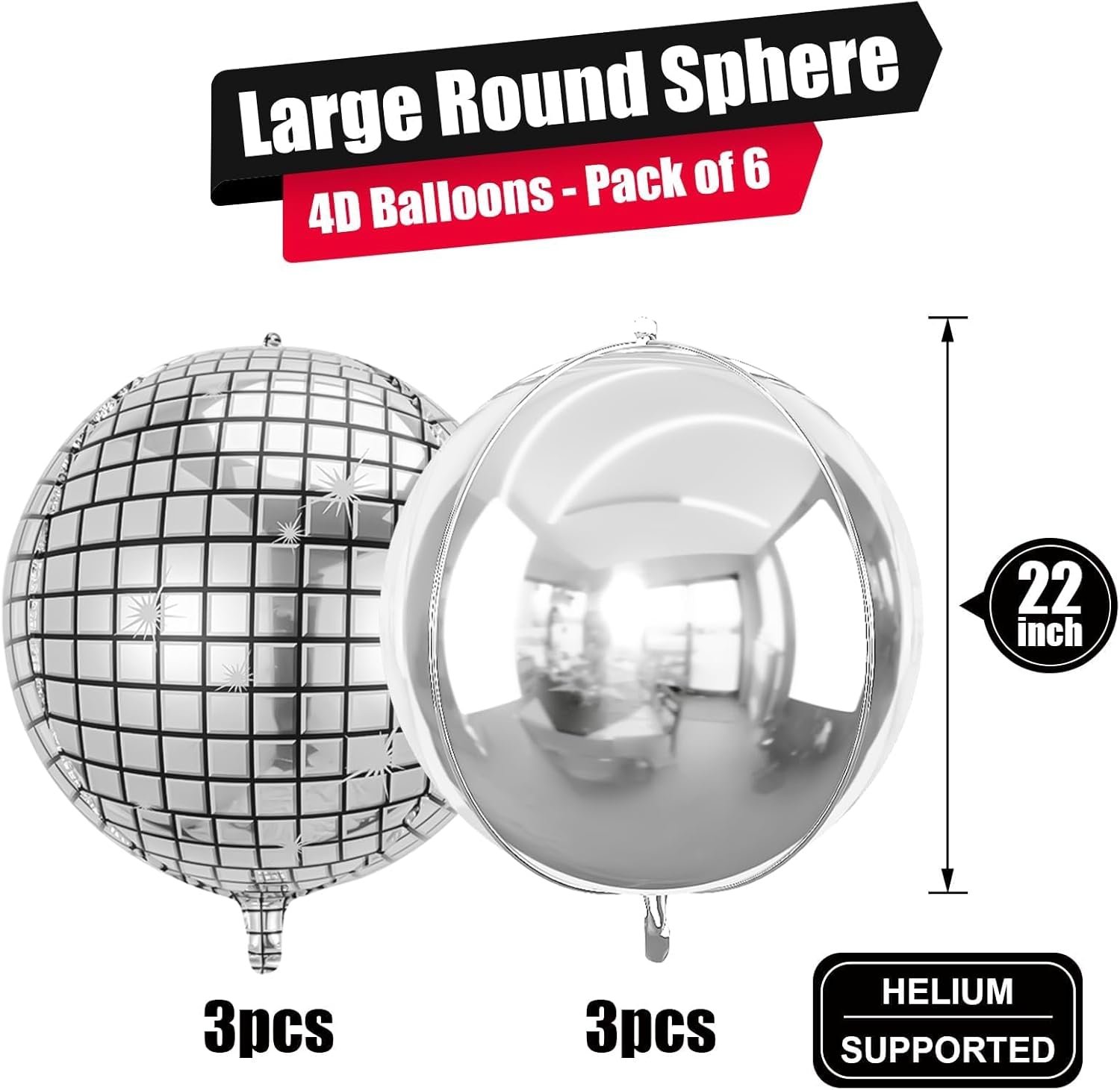 - Package: You will receive 6pcs 22inch 4D round foil balloon, 3pcs disco ball balloons + 3pcs silver foil balloons + 1 straw + 1 roll of ribbon. The classic disco chrome balloons are perfect for any 70s 80s 90s themed party.
