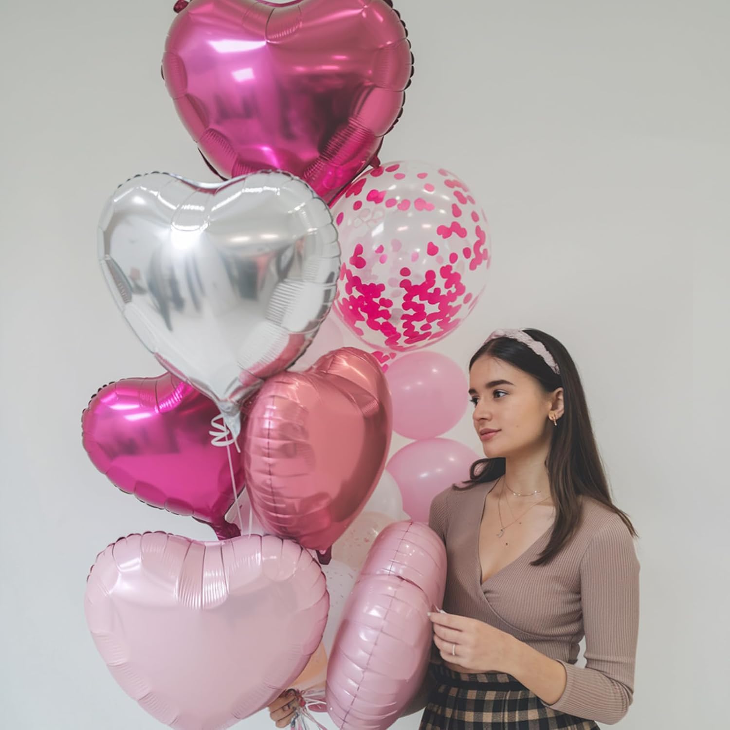 - Charming Hot Pink Silver Heart Balloons: Elevate your celebration with our set of 12 heart-shaped pink silver balloons, each measuring 18 inches. Accompanied by a ribbon, these balloons are ideal for creating a festive and loving atmosphere at any special event.