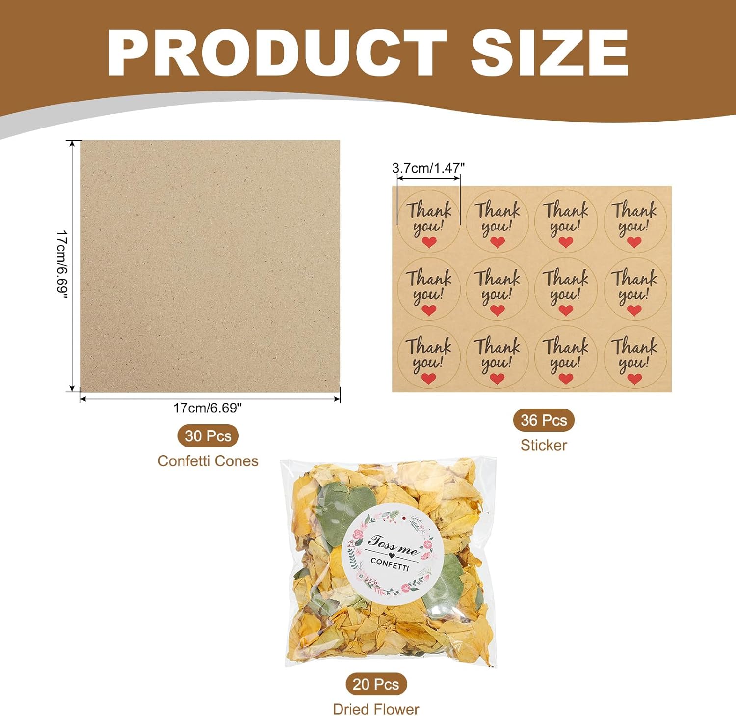 - Material: Paper; Color: Yellow/Green; Paper Cone Size: 17 x 17 cm / 6.69 x 6.69 inch (LxW); Sticker Diameter: 3.7 cm / 1.47 inch; Dried Flower Weight: 160 g / 3.4 qt / 5.75 oz; Package List: 30 Pcs x Confetti Cones, 20 Pcs x Dried Flower, 36 Pcs x Sticker