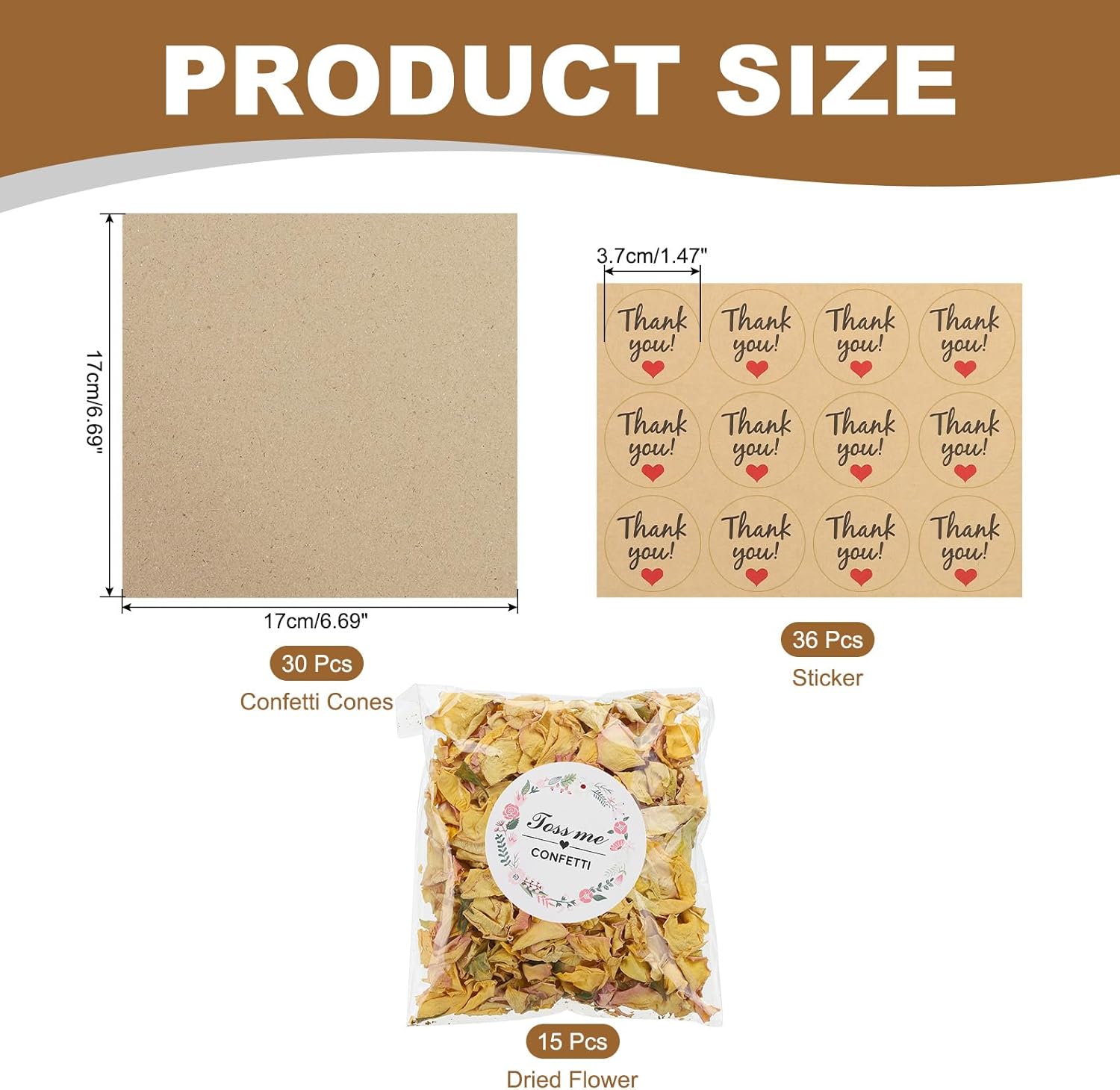 - Material: Paper; Color: Light Yellow/Pink; Paper Cone Size: 17 x 17 cm / 6.69 x 6.69 inch (LxW); Sticker Diameter: 3.7 cm / 1.47 inch; Dried Flower Weight: 160 g / 3.4 qt / 5.75 oz; Package List: 30 Pcs x Confetti Cones, 15 Pcs x Dried Flower, 36 Pcs x Sticker