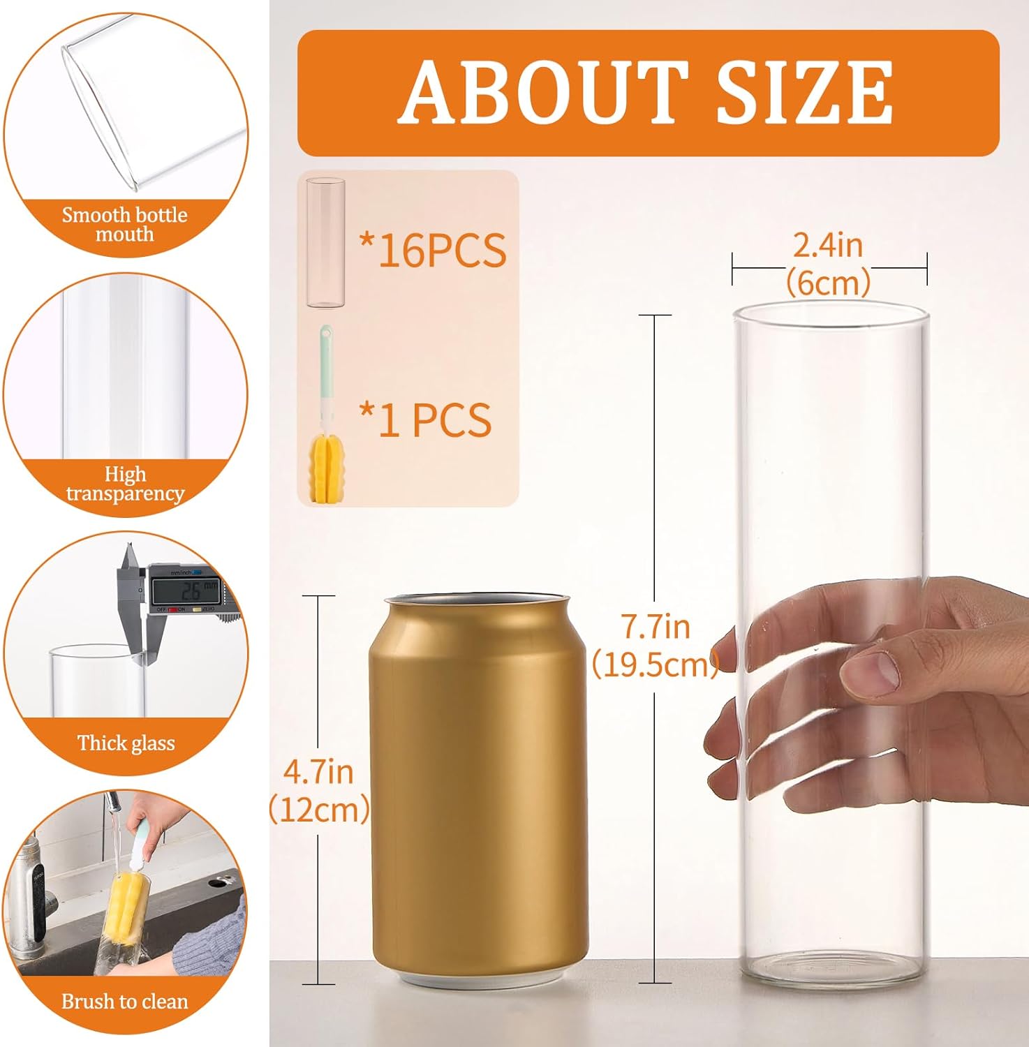- 【PACKAGE INCLUDES】 16 clear glass bud vases measuring 2.4 inches in diameter and 7.7 inches in height, comes with a brush for cleaning the vases, ideal for parties, events, home decorations, table centerpieces, flower arrangements, floating candlesticks.