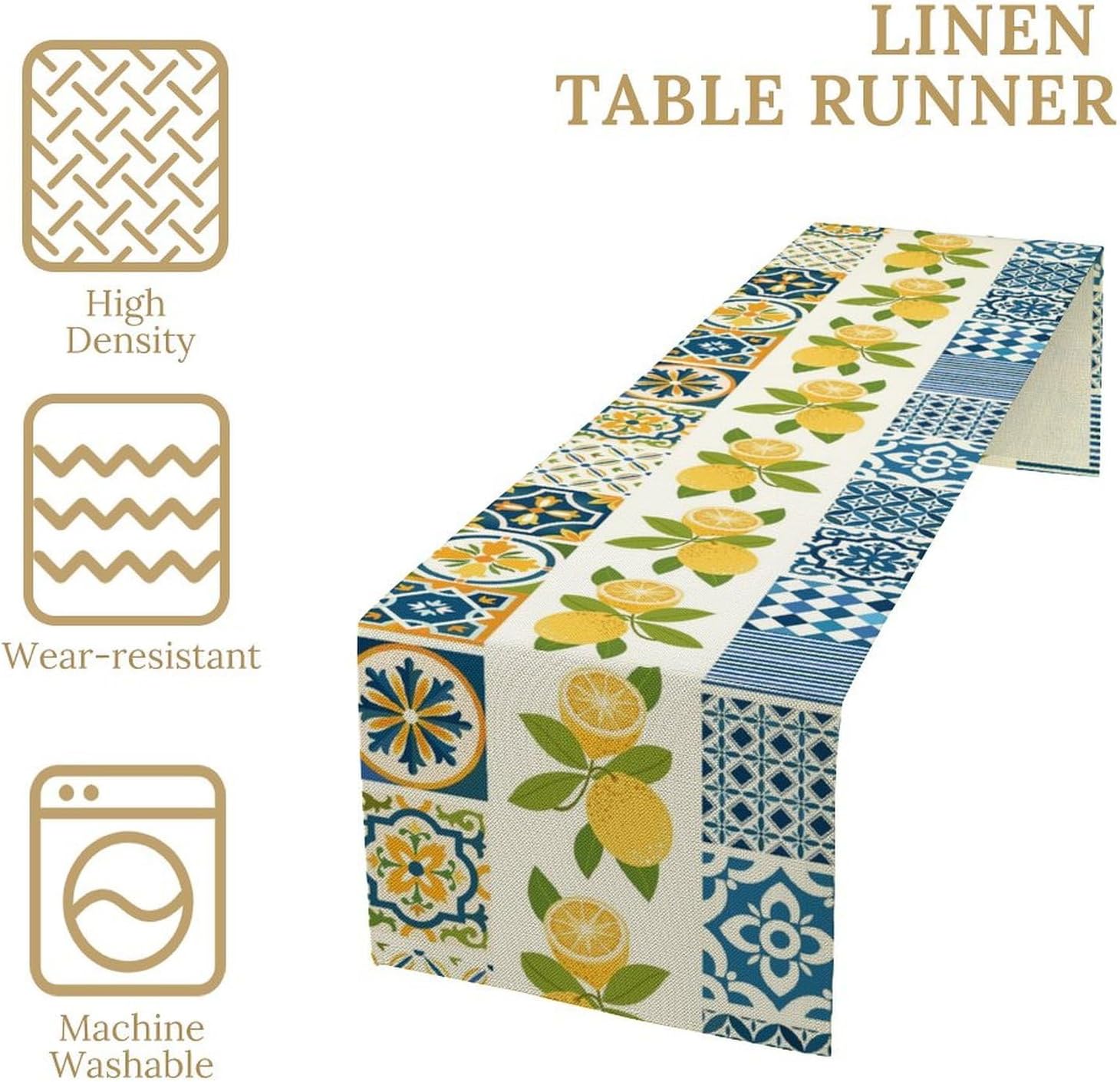 Lemon Table Runner,Watercolor Blue Fruits Green Leaves Print Table Cloth Kitchen Dining Table Home Party Decoration 13x72 Inch