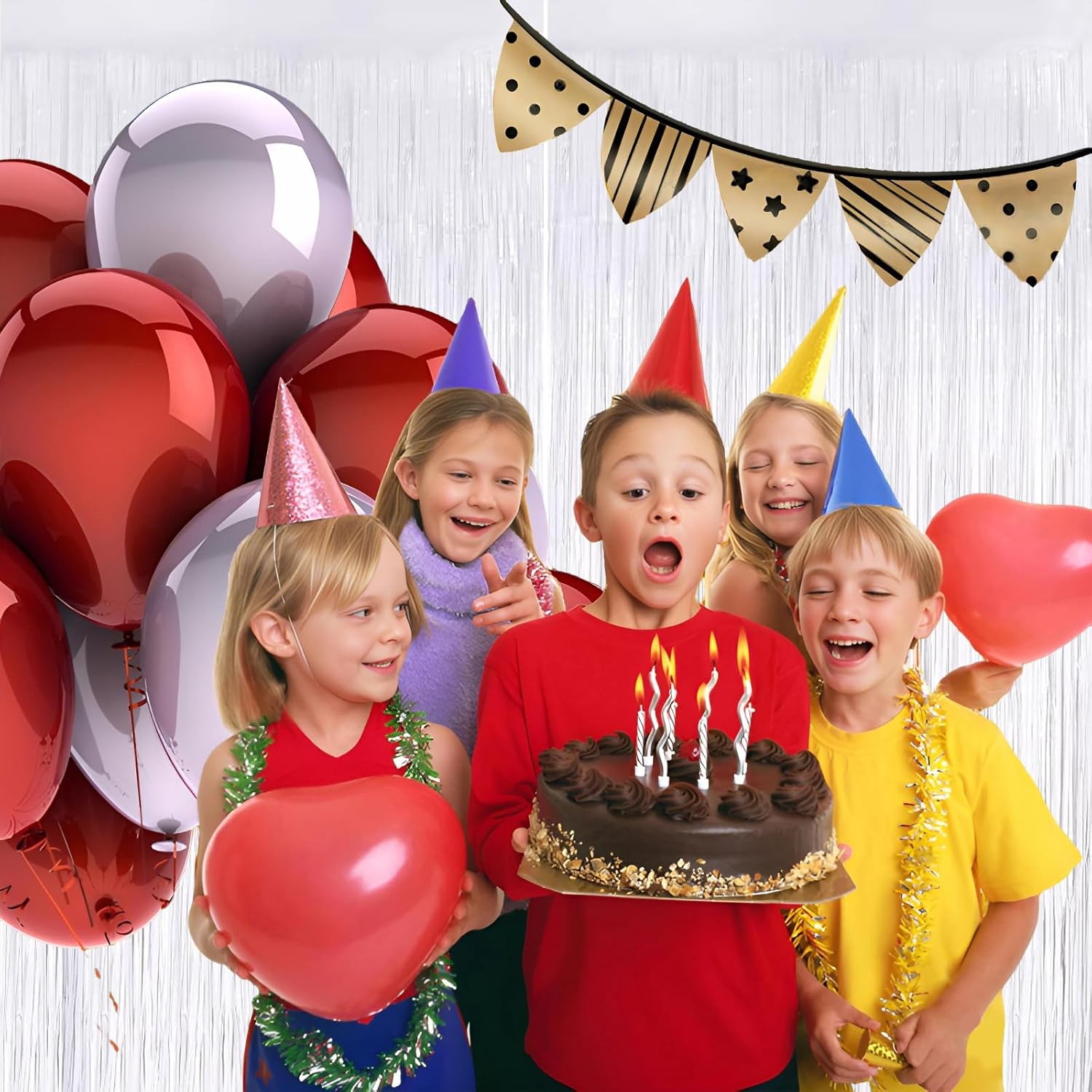 - Pair with other party decorations: Tinsel backdrop curtain can be paired with LED lights, balloons, banners, wreath, garlands, swirl streamer, tissue paper pom poms.