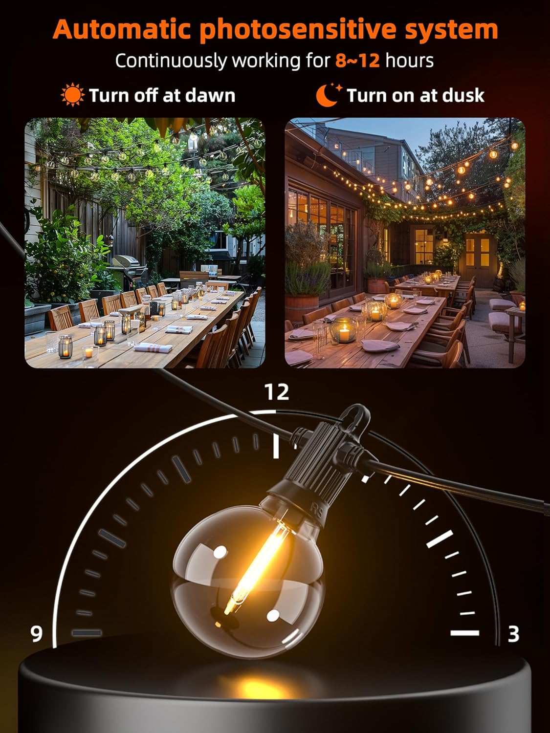 - ENERGY SAVING STRING: G40 solar LED string lights use patented LED filament technology, setting a new standard in energy conservation. Compared to tungsten filaments, these lights save up to 90% energy efficiency per hour and has a service life of up to 30,000 hours. The 100FT long string, equipped with 50+2 bulbs and 50+2 patented LED filaments. backyard solar lights not only meets the basic lighting needs of campers, but also enhances the enjoyment and comfort of outdoor activities.