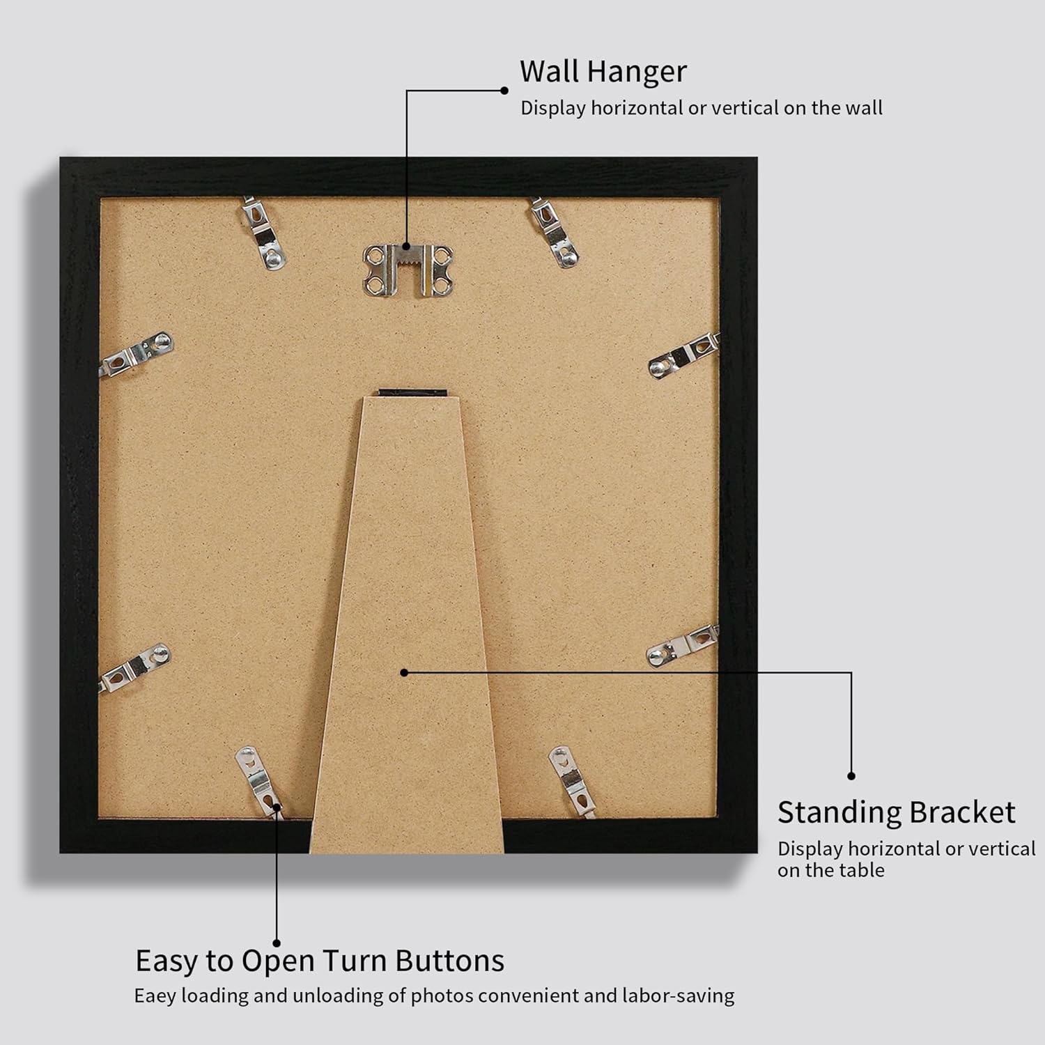 - Multi Frames Collage Set: Includes 4 frames in the same size. Perfectly fits 10x10 inch pictures with mat or 12x12 inch without mat. The frame opening display size is 0.5 inches smaller than the photo size for secure mounting.