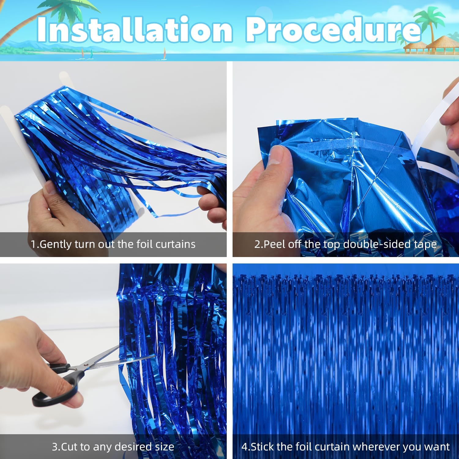 - Blue Birthday Decorations:5 packs of foil fringe curtains, the size of the foil curtain is 3.28 ft x 6.56 ft.It's long enough to fit any occasion. Please do not stick the foil curtain on uneven or stained walls to prevent it from falling off.
