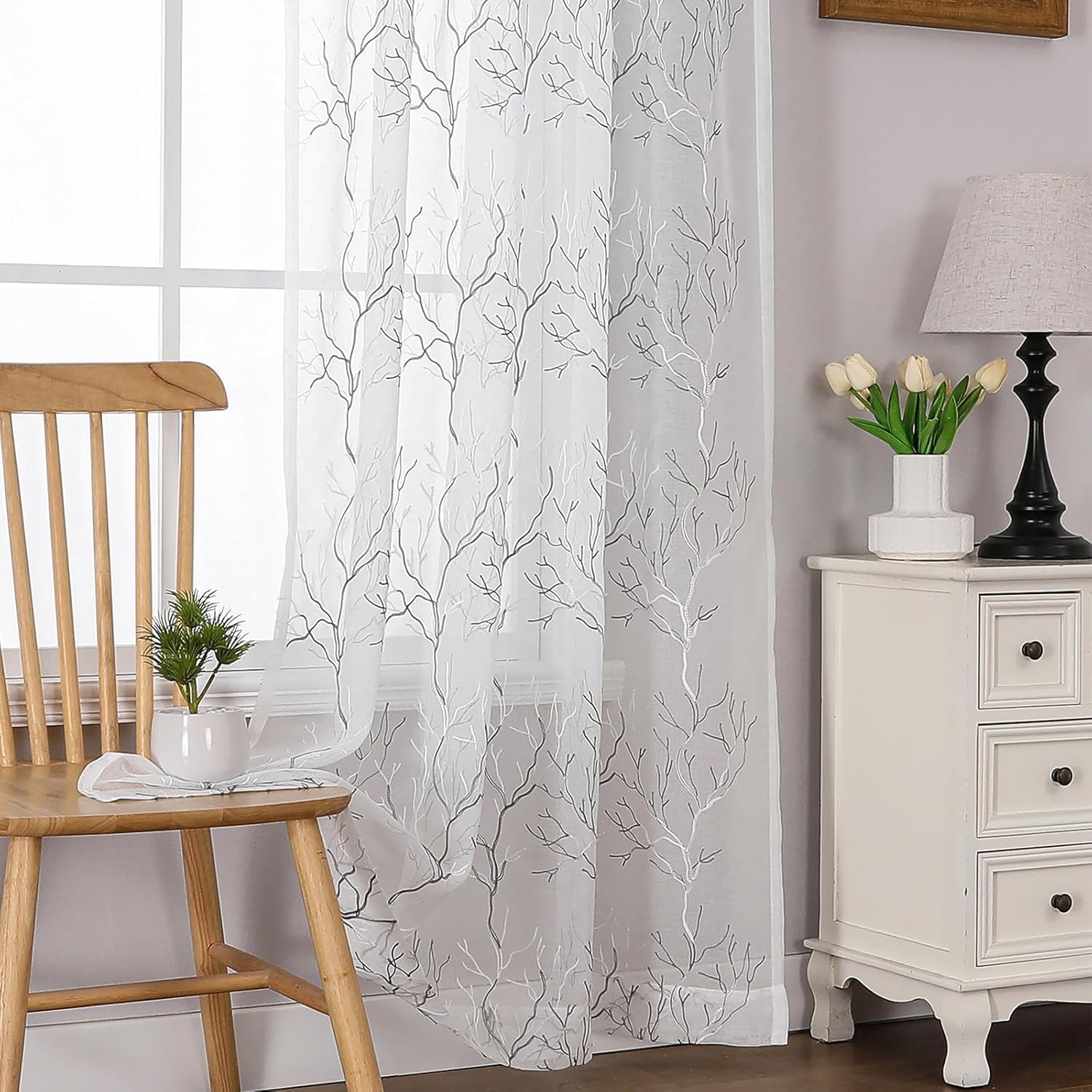 VISIONTEX Sheer Curtains 72 inch Length 2 Panels Set, Decorative Grey Coral Embroidery, Rod Pocket Embroidered Window Drapes for Living Room and Bedroom, 54" x 72"