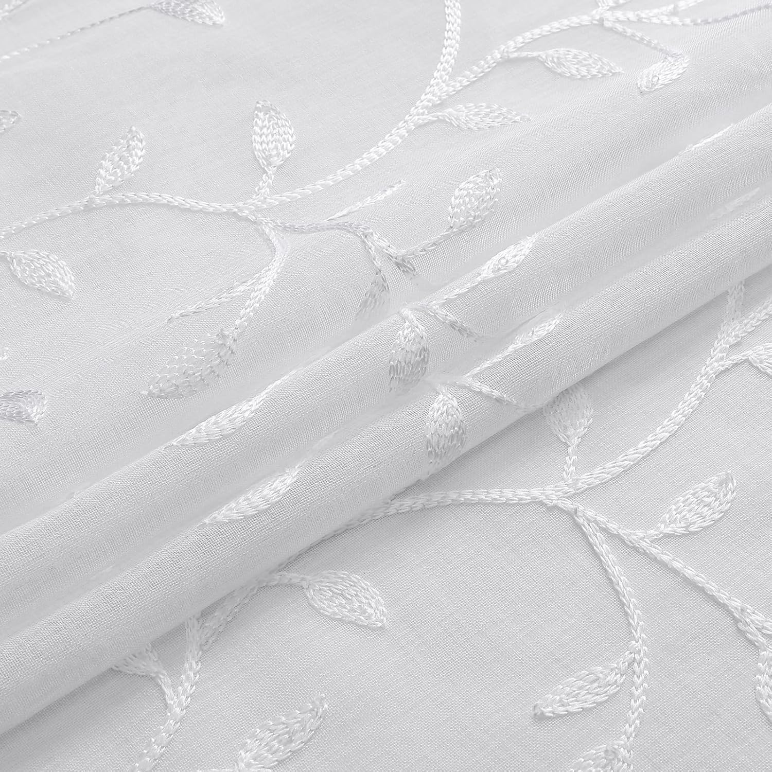 VISIONTEX White Sheer Voile Curtains, Decorative Leaves Embroidery Faux Linen Rod Pocket Window Drapes for Home Kitchen, Living Room and Bedroom 54 x 95 Inch, Set of 2 Curtain Panels