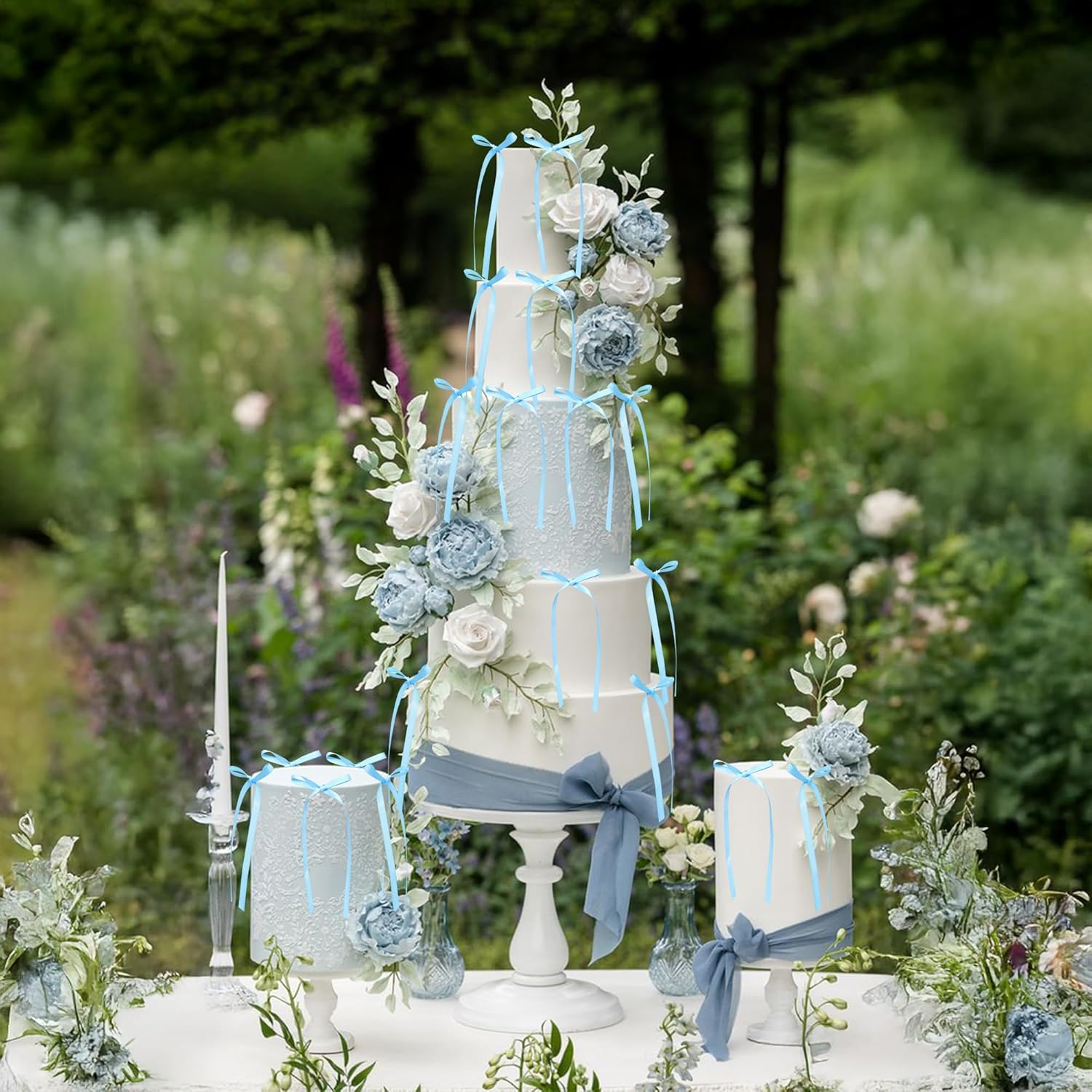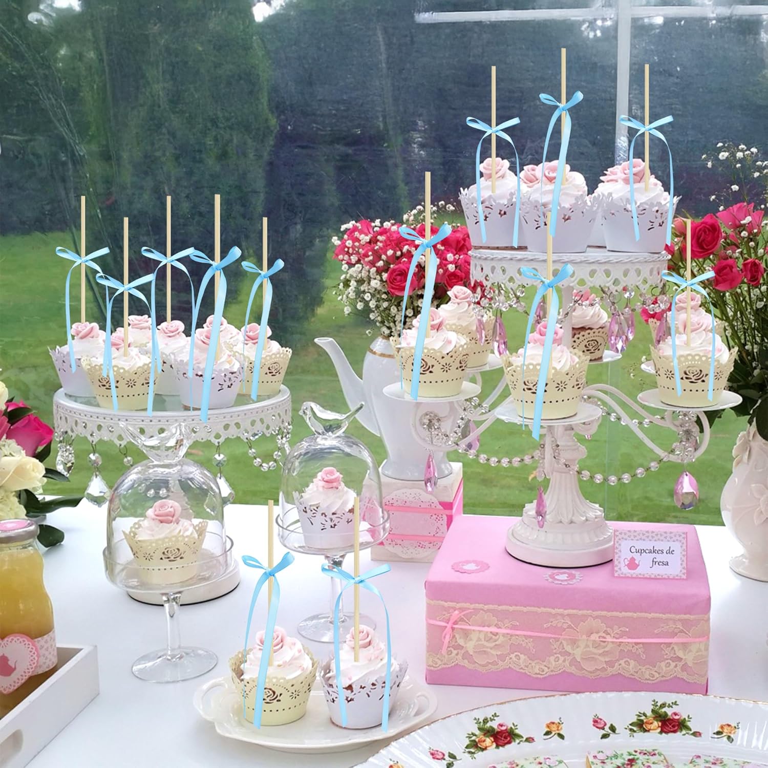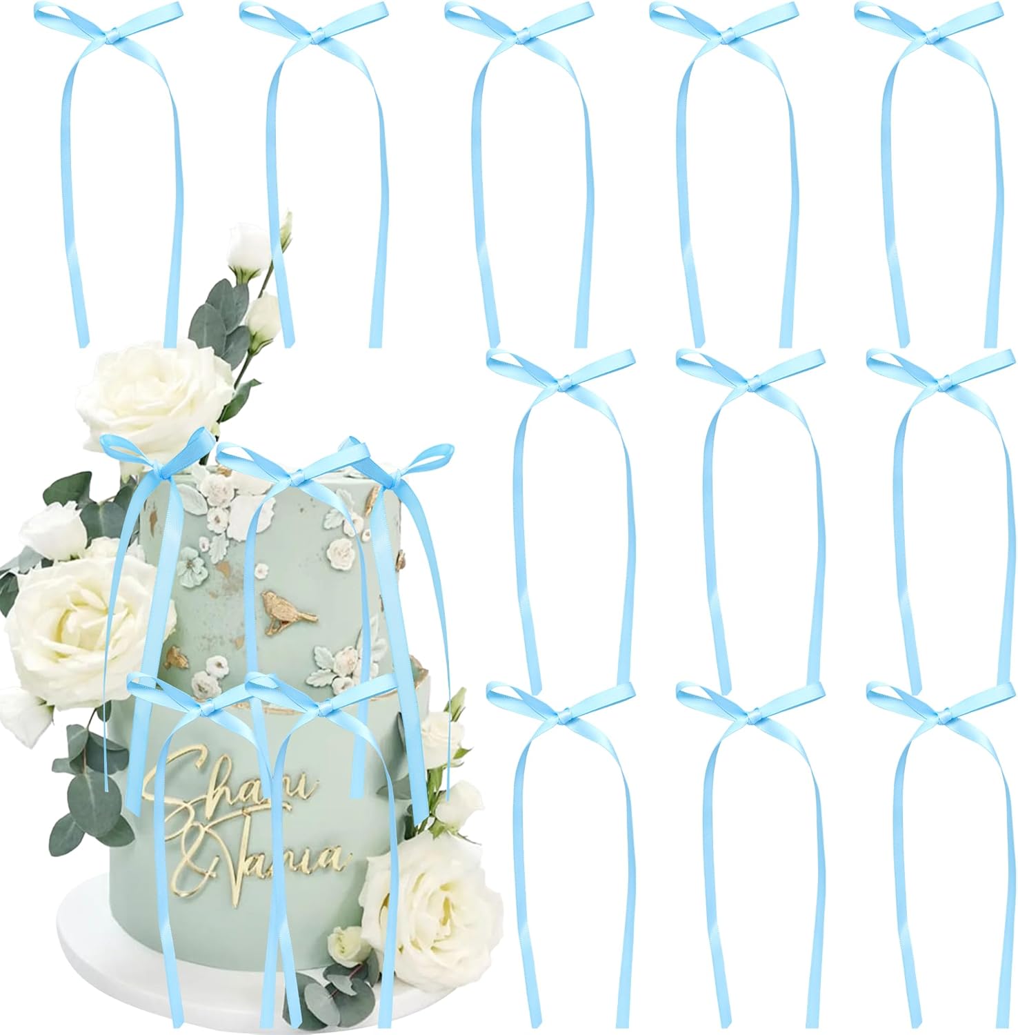 Ephlyn 30Pcs Bow Cupcake Toppers Valentine's Bowknot Ribbons Coquette Bow High Footed Cup Balloon Wall Party Decorations Cake Dessert Picks Baby Girl Birthday Wedding Party Supplies Lake Blue