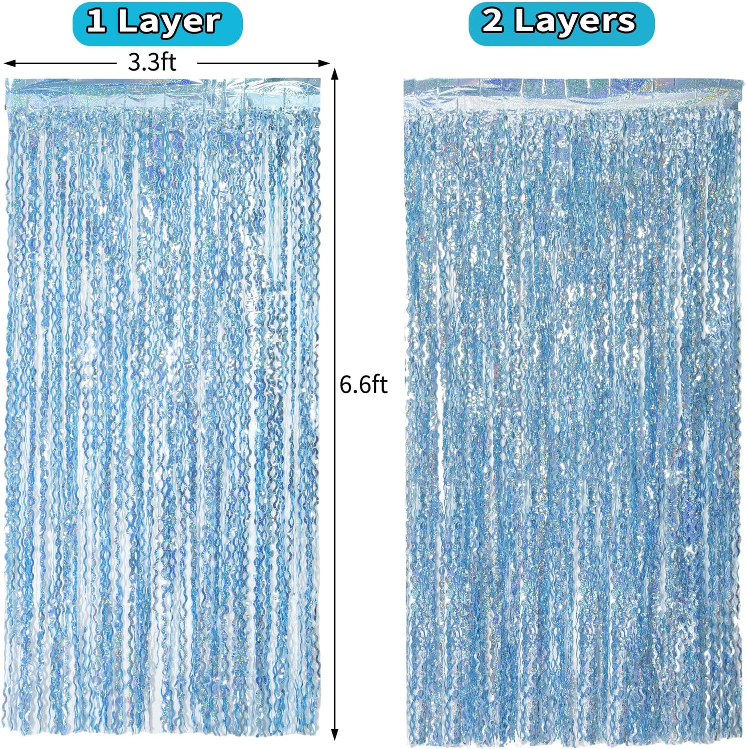 - Package Contents: 4 pack wavy foil fringe curtains,each curtain is 3.3ft x6.6ft,You can cut the metallic backdrop into the suitable length for use,Wonderful accessories for decorating doors and walls